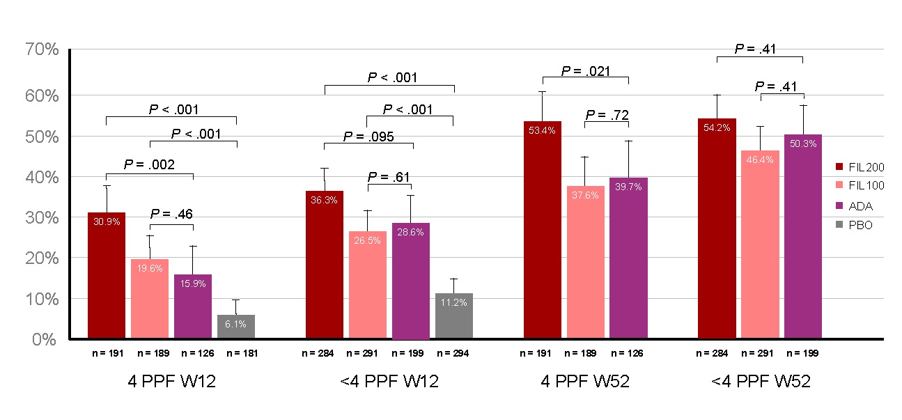 Figure 1. Proportions with DAS28(CRP) < 2.6 at W12 and W52. P-values are nominal. ADA, adalimumab; DAS28(CRP), Disease Activity Score in 28 joints with C-reactive protein; FIL100, filgotinib 100 mg; FIL200, filgotinib 200 mg; PBO, placebo; PPF, poor prognostic factor; W, week.