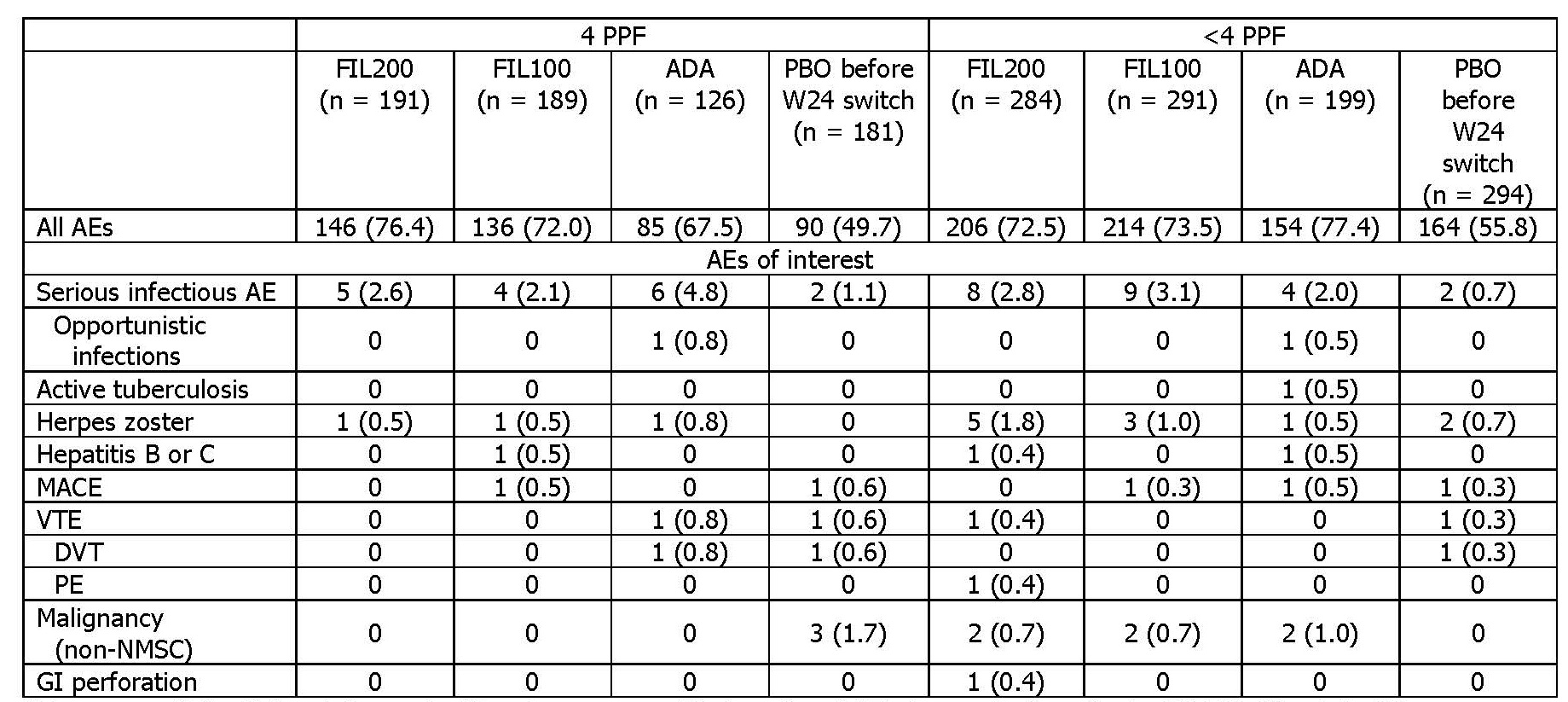 Table 1. AEs and AEs of interest in BL 4 PPF and < 4 PPF subgroups. Values are n (%). ADA, adalimumab; AE, adverse event; BL, baseline; DVT, deep vein thrombosis; FIL100, filgotinib 100 mg; FIL200; filgotinib 200 mg; GI, gastrointestinal; MACE, major adverse cardiac event; NMSC, nonmelanoma skin cancer; PBO, placebo; PE, pulmonary embolism; PPF, poor prognostic factor; VTE, venous thromboembolism; W, week.