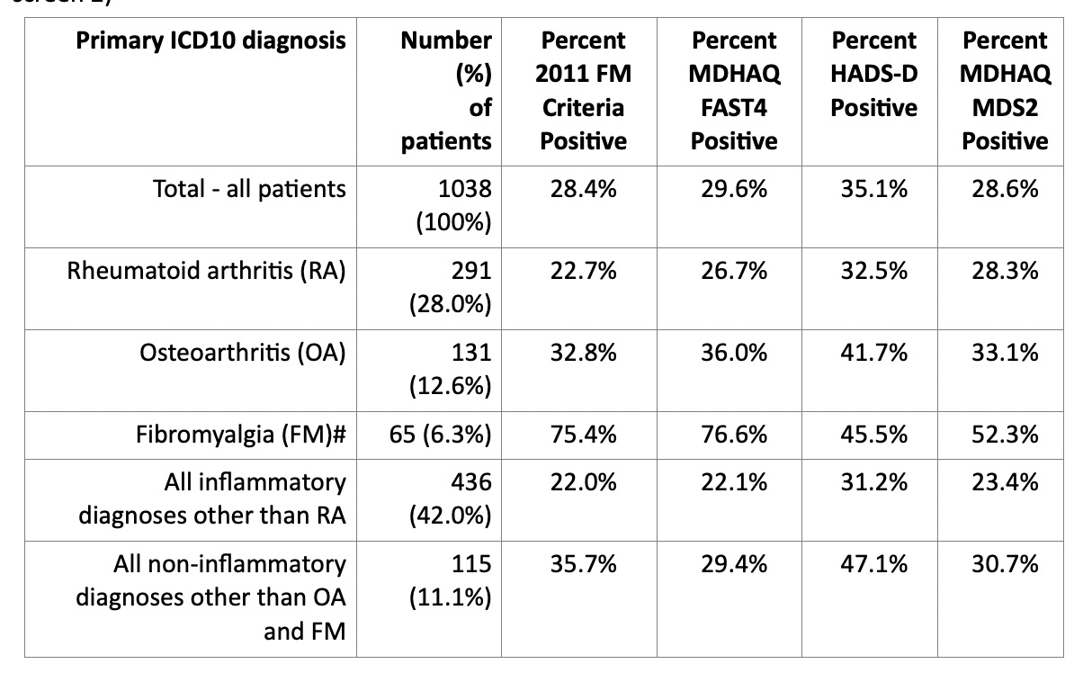 Table. Number (percent) of patients according to Primary ICD 10 diagnosis, and percent positive by 2011 revised FM criteria fibromyalgia criteria, FAST4 (fibromyalgia assessment screening tool, HADS-D (hospital anxiety and depression scale–depression) and MDS2 (MDHAQ depression screen 2)