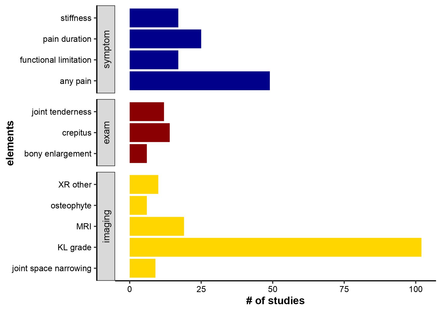 Symptom, exam, and imaging elements included in EsKOA definitions in the studies identified by our scoping review