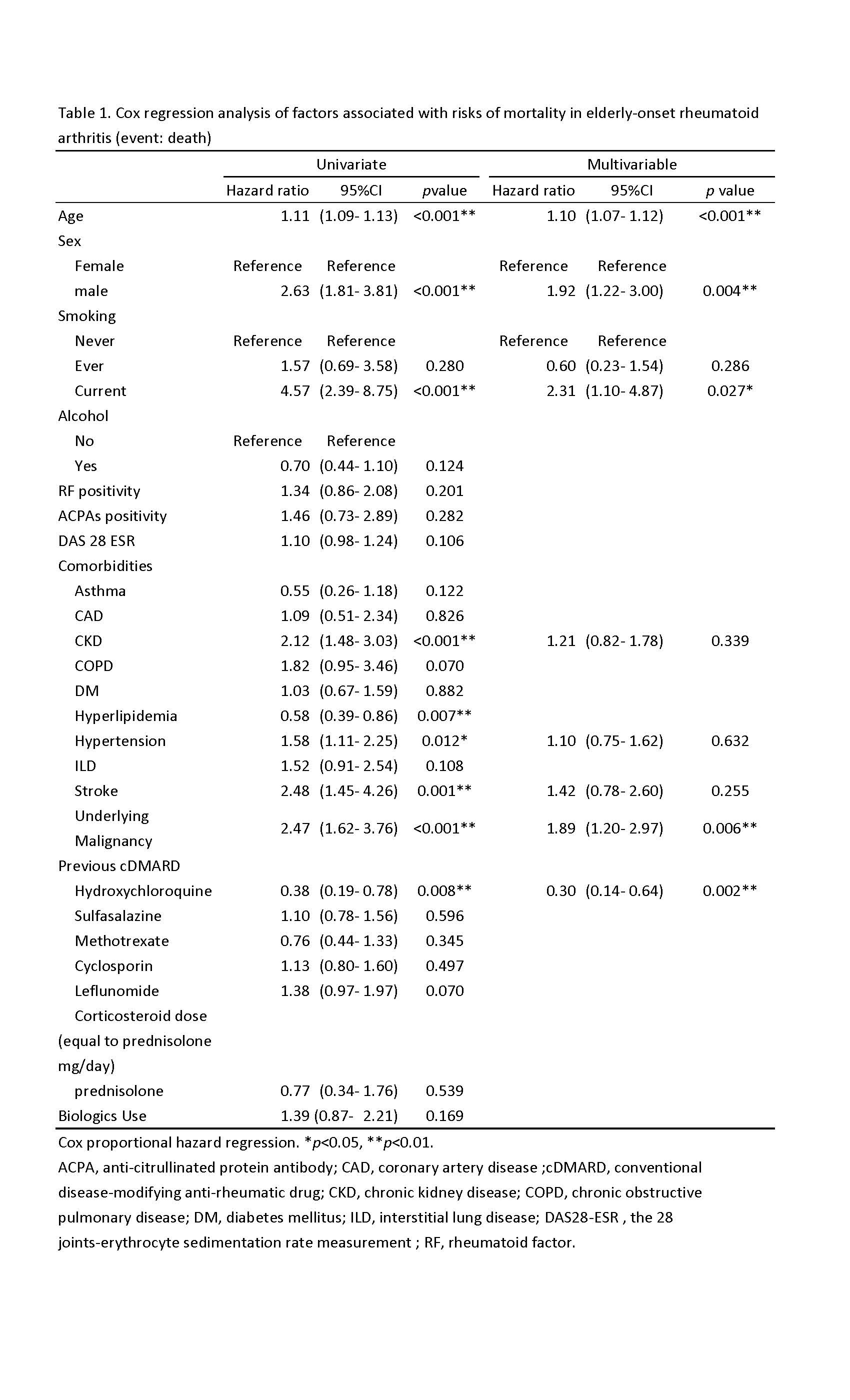 Table 1. Cox regression analysis of factors associated with risks of mortality in elderly-onset rheumatoid arthritis