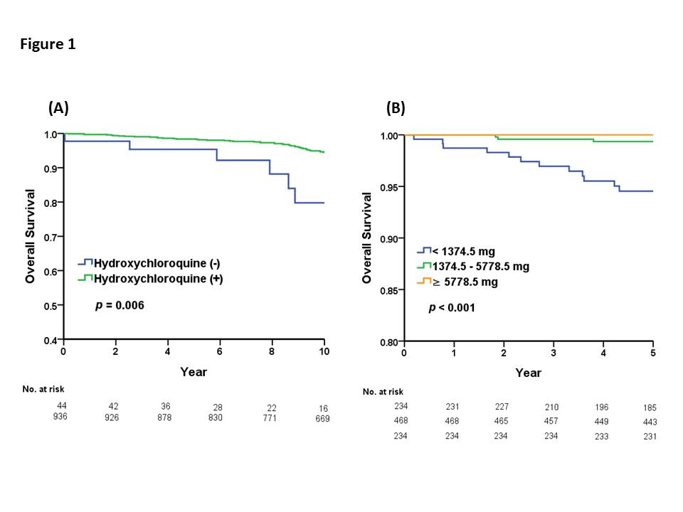 Figure 1. (A) The overall 10-year Kaplan-Meier survival probability of hydroxychloroquine and non-hydroxychloroquine group, and (B) the overall 5-year Kaplan-Meier survival probability stratified by monthly cumulative dose of hydroxychloroquine with ≧5778.5mg, 5778.5-1374.5mg and < 1374.5mg in elderly-onset rheumatoid arthritis patients.