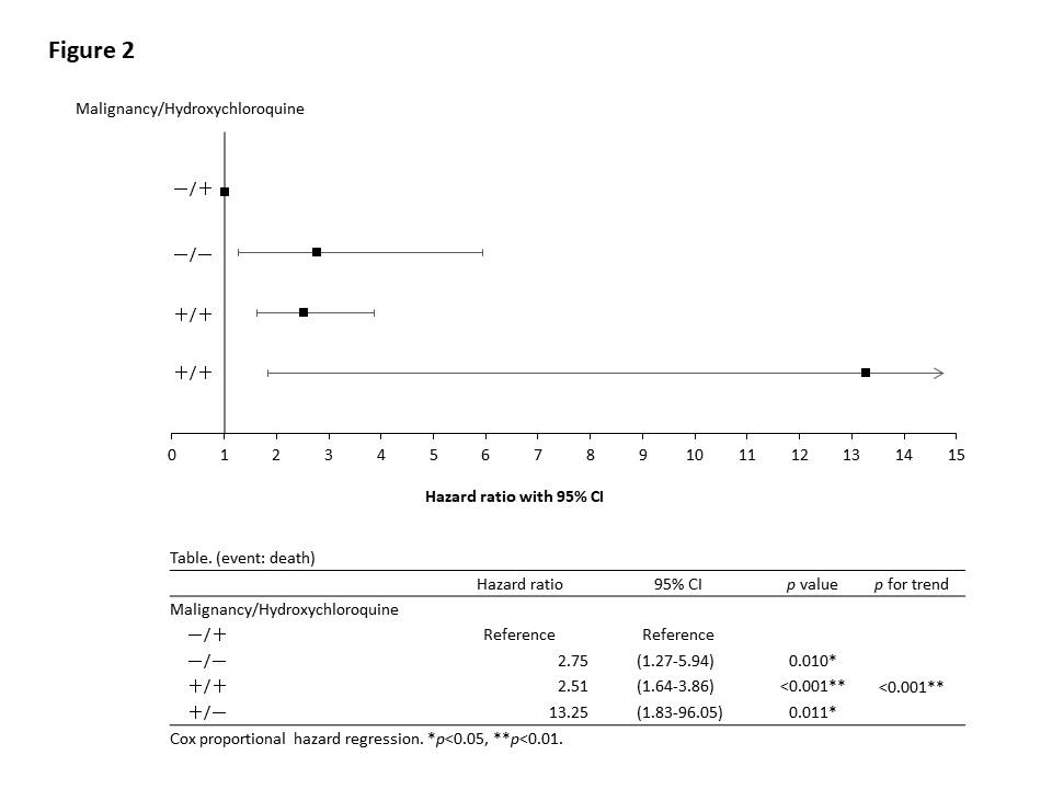 Figure 2: Risk of mortality in elderly-onset rheumatoid arthritis patients stratified by the presence of malignancy and the use of hydroxychloroquine. Error bars represent the 95% confidence intervals (CI) of the Hazard ratios (HR).