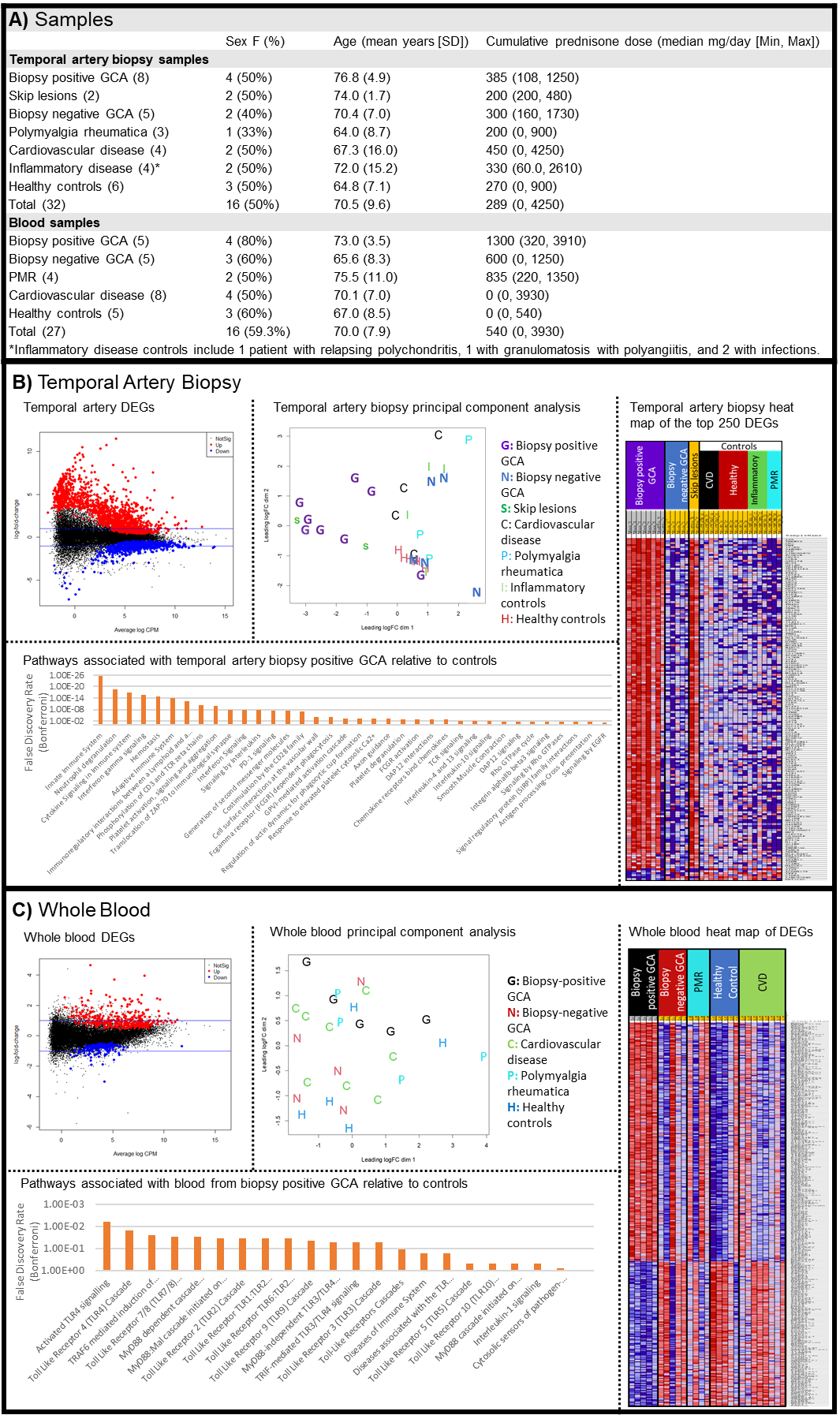 Figure 1: Temporal artery biopsy and whole blood gene expression: A) Samples collected from temporal artery biopsies and whole blood. B) Temporal artery biopsy gene expression results reveal significantly differentially expressed genes in biopsy positive GCA compared to controls, as well as clustering of biopsy positive GCA and skip lesions, but no clustering of biopsy negative GCA samples. C) Whole blood gene expression reveals differentially expressed genes in biopsy positive GCA compared to controls, but with significant overlap among control groups; biopsy negative GCA blood does not reveal any significantly differentially expressed genes.