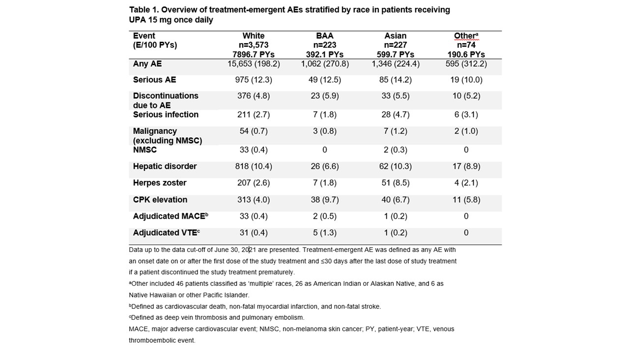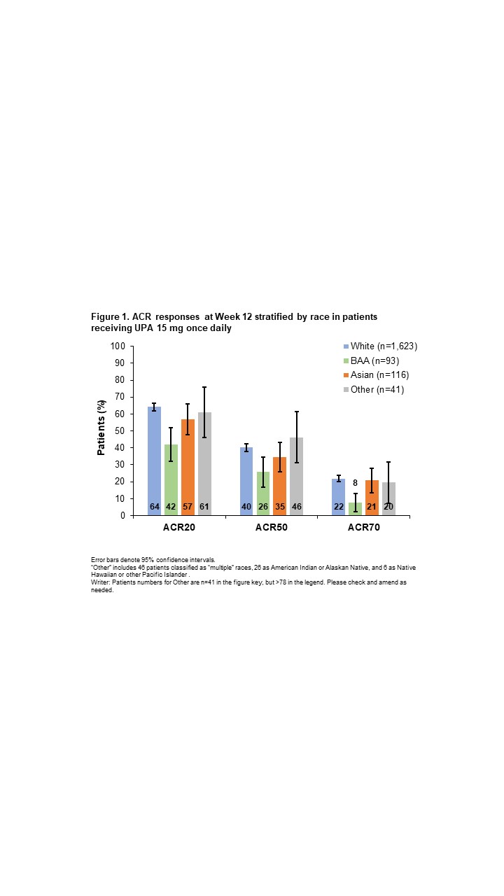 Conclusion: In patients with RA, UPA was efficacious across all race groups; however, efficacy was generally lowest in BAA patients vs other race groups. Safety was comparable across groups, except for a higher overall AE rate among non-White patients and higher rates of some AEs of special interest in Asian and BAA patients. Results should be interpreted with respect to small patient numbers; future studies should evaluate factors underlying racial disparities in larger populations.