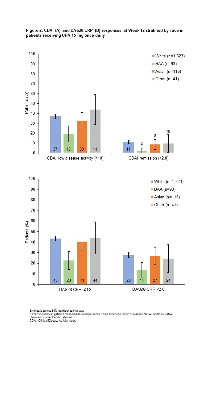 Results: Efficacy was analyzed in 1,873 patients (White, n=1,623; BAA, n=93; Asian, n=116; Other, n=41). Baseline characteristics were generally similar across groups, although White and BAA patients had a longer disease duration, and higher proportions of BAA and Other patients had a BMI ≥30 kg/m2. ACR20/50/70 responses (20%/50%/70% improvement in ACR scores) with UPA were generally similar for White, Asian, and Other patients, but lower for BAA patients, particularly ACR70 (Figure 1). Similar patterns were observed for achieving Clinical Disease Activity Index low disease activity and remission (Figure 2A) and 28-joint DAS with CRP (DAS28-CRP) ≤3.2 and < 2.6 (Figure 2B). Least squares mean change from baseline at Week 12 in the HAQ-Disability Index score was greatest for Other patients, followed by Asian, White, and BAA patients (−0.86 [n=35], −0.77 [n=86], −0.67 [n=1,372], and −0.33 [n=74], respectively). Reductions in patient's global assessment of pain were similar for Asian, Other, and White groups (−35.82 [n=86], −35.27 [n=35], and −33.42 [n=1,374], respectively), with the lowest reduction observed in BAA patients (−23.13 [n=74]). Safety was assessed in 4,097 patients (White, n=3,573; BAA, n=223; Asian, n=227; Other, n=74). Overall AE rates were higher among non-White vs White patients, whereas rates of serious AEs and AEs leading to treatment discontinuation were generally similar across groups (Table 1). Most AEs of special interest occurred infrequently, although rates of serious infection and herpes zoster were highest in Asian patients, and rates of creatine phosphokinase (CPK) elevations and adjudicated venous thromboembolic events were highest in BAA patients.