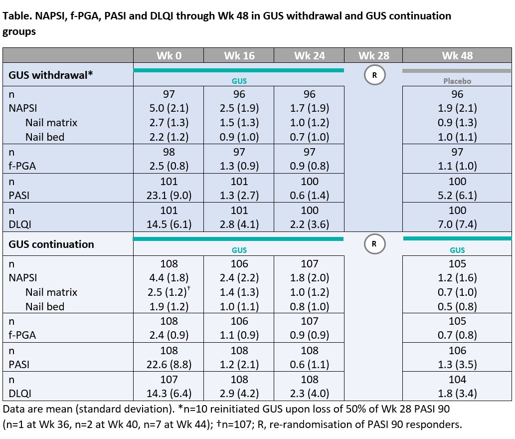 Data are mean (standard deviation). *n=10 reinitiated GUS upon loss of 50% of Wk 28 PASI 90