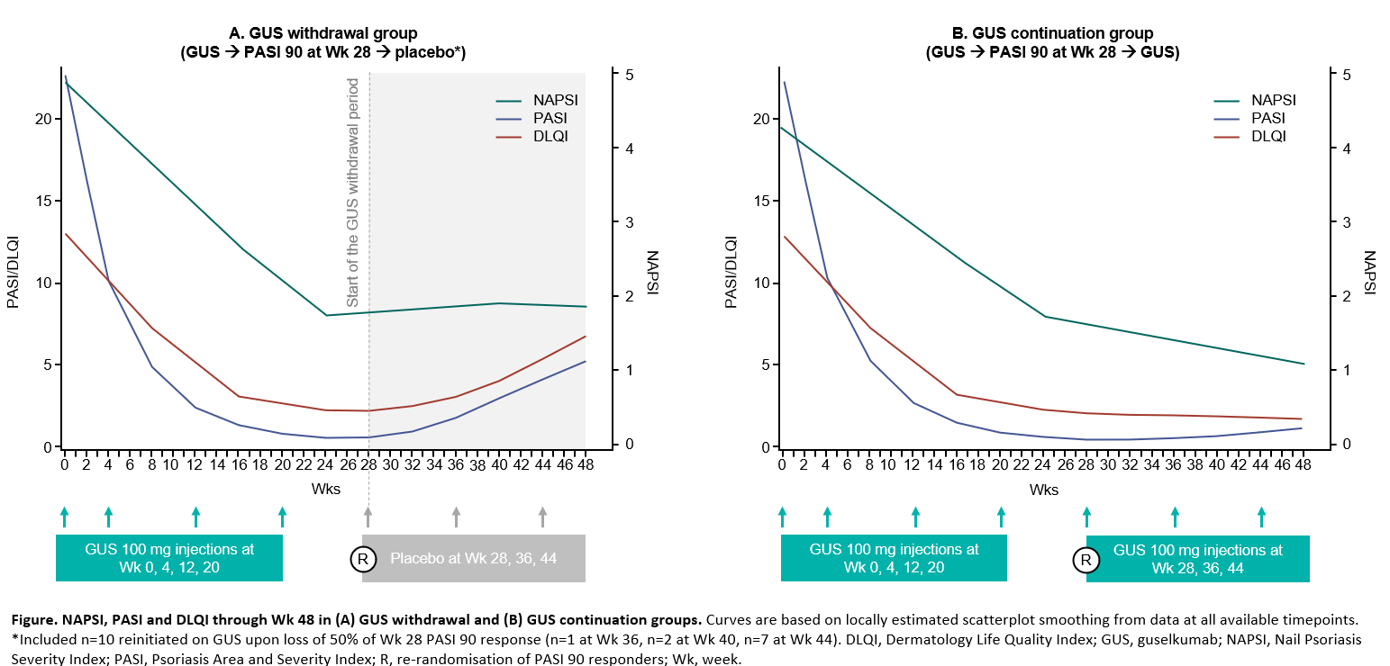 Figure. NAPSI, PASI and DLQI through Wk 48 in (A) GUS withdrawal and (B) GUS continuation groups. Curves are based on locally estimated scatterplot smoothing from data at all available time points. *Included n=10 reinitiated on GUS upon loss of 50% of Wk 28 PASI 90 response (n=1 at Wk 36, n=2 at Wk 40, n=7 at Wk 44). DLQI, Dermatology Life Quality Index; GUS, guselkumab; NAPSI, Nail Psoriasis Severity Index; PASI, Psoriasis Area and Severity Index; R, re-randomisation of PASI 90 responders; Wk, week.