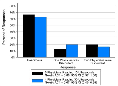 Results: Six rheumatologists with a mean (SD) of 7.5 (5.6) years reading US evaluated 15 patients' hand and wrist US images and a subset of 4 rheumatologists evaluated an additional 15 patients (for a total of 30 image series) as a sensitivity analysis. All rheumatologists reported formal training in US. In 48 questions related to the US for each patient, the median Gwet's AC1 was 0.78 with an interquartile range of [0.68, 0.85]. The question, "Is inflammatory arthritis present on these US findings?", the responses were unanimous in 10 out of 15 cases. In 2 cases, 1 rater was discordant (e.g., 1 yes and 5 no responses) and in 3 cases, 2 raters were discordant: Gwet's AC1 = 0.80; 95% CI (0.57, 1.00). The results for this question were similar in the sensitivity analysis as 4 raters were unanimous in 19 out of 30 images and Gwet's AC1 = 0.67; 95% CI (0.46, 0.88).