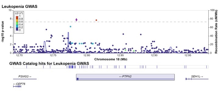 Conclusion: We describe novel variants in the PTPN2 locus associated with leukopenia among TPMT and NUDT15 normal metabolizers taking azathioprine for inflammatory or autoimmune conditions. PTPN2 region and the associations with leukopenia (cases = 125; controls = 1059; total = 1184) Disclosures: J. Zanussi, None; P. Nepal, None; A. Dickson, None; L. Daniel, None; P. Straub, None; T. Miller-Fleming, None; W. Wei, None; A. Hung, None; N. Cox, None; V. Kawai, None; J. Mosley, None; M. Stein, None; Q. Feng, None; G. Liu, None; R. Tao, None; C. Chung, None.