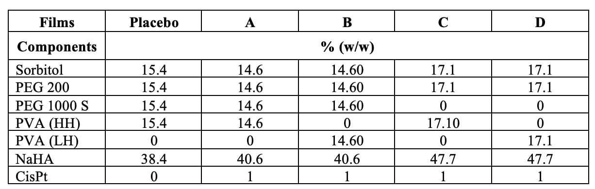 Cisplatin release from fresh film was the same for all compositions, with about 85% of CisPt released in 48h. During the release from films of composition C, an interaction of the vial with light gave a blue reflection, suggesting the formation of colloidal structures. DLS analysis of these samples evidenced the presence of nanoparticles with a mean diameter of 102.6 ± 20.85 nm and PDI of 0.338 ± 0.12. Zeta potential was negative, as expected due to the anionic polymer. Conclusion: Overall, the study is still ongoing with the aim to verify the film stability of film under accelerated stress conditions. Cisplatin release from fresh film was not affected by the change in the composition. CisPt release and NaHA dissolution from aged film in accelerated stability conditions would be further investigated.