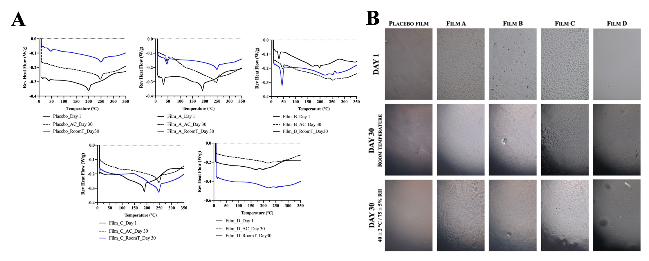 Figure 1. (A) Differential scanning calorimetry (DSC) scans of the films freshly prepared and after exposure to 40 °C/75% RH (accelerated stability, AC) and to room temperature (RoomT) for 1 month. (B) Polarized light microscopic images (10x) of the films at day 1 and after 1 month at room temperature and under accelerated stress conditions (402 °C / 755% RH).