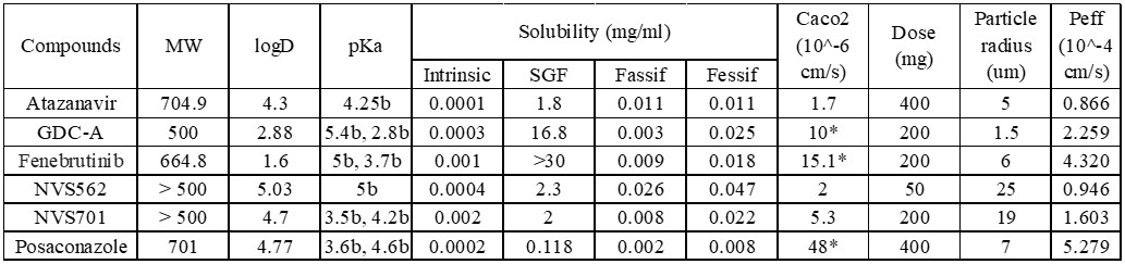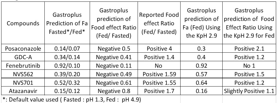 pH (t)= pH (0)*exp^(- K1*t) (Eq.1) Mass (t) = Mass (0)*exp^(-K2*t) (Eq.2) Sum of pH(t)*Mass(t)=pH(0)*Mass(0)+pH(1)*Mass(1)+…+pH(t-1)*Mass(t-1)+pH(t)*Mass(t) (Eq.3) Sum of Mass(t)=Mass(0)+Mass(1)+…+Mass(t-1)+Mass(t) (Eq.4) Kinetic pH (KpH) = Sum of pH(t)*Mass(t) / Sum of Mass(t) (Eq.5) Where: pH (t): pH of the stomach at time t pH (0): pH of the stomach at time 0 K1: first order rate constant for pH drop K2: first order transit rate constant for drug transit Mass(0): the initial dose Mass (t): the mass of the drug in the stomach at time t Results: The kinetic pH calculator was successfully built and the kinetic gastric pH (hereafter referred as KpH) was calculated based on separate literatures (2). In this case, reported stomach pH time profile after a high fat meal was found to have the best fit with K1 of 0.0165 min-1. With the drug transit constant (K2) of 0.01155 min-1 (3) and total simulation time of 240 minutes (4 times transit half-life)), a KpH value of 2.9 at fed state was obtained. The same approach was applied using other literature reports and found the fed KpH values was between 2.8 to 2.7. The obtained values were significantly different from the default value in Gastroplus. Therefore, the default stomach pH setting in Gastroplus may be overestimated under the fed condition (i.e. pH 4.9). This over estimation of pH with the single compartment assignment of the gastric will result in under prediction of solubilization of some basic drugs in the stomach and cause deviations. Figure 2 listed all the physiochemical properties of the compounds in our investigation (4). For all compounds, literature data (MW, diffusion coefficient, LogD/P, pKa, permeability, particle size) were entered to establish a model first, the prediction of fraction absorbed (Fa) for both Fed and Fasted were executed with the Gastroplus default settings. Following the same exercise, the KpH values of 2.9 was used to replace the default pH 4.9 for the fed conditions and predicted Fa for Fed were simulated for each compound again. A summary of the above exercise is presented as figure 3. The predicted food effect based on physicochemical properties of each compound was estimated using the Fa ratio (Fed/Fasted) and tabulated in figure 3. In general, when default gastric pH (pH 4.9 for the fed) were used for simulation, negative food effect were predicted for several compounds where the reported clinical data are all positive. On top of that, the degree of errors for several compounds are very significant. The above prediction error was significantly reduced when fed KpH was used for simulation. Most importantly, no false negative food effect was predicted. Conclusion: Overall, using the KpH to replace the default pH performs well for predicting food effect for all test compounds. All false negative predictions were successfully corrected. Most importantly, this exercise enable us to continuously use the current ACAT model without rewriting the program or adding additional compartments for the stomach. References: 1. Agoram B, Woltosz WS, Bolger MB. Predicting the impact of physiological and biochemical processes on oral drug bioavailability. Adv Drug Deliv Rev. 2001;50(Suppl 1):S41–S67. 2. Dressman, J. B., Berardi, R. R., Dermentzoglou, L. C., Russell, T. L., Schmaltz, S. P., Barnett, J. L., & Jarvenpaa, K. M. (1990). Upper gastrointestinal (GI) pH in young, healthy men and women. Pharmaceutical research, 7(7), 756–761 3. Sugano K. Biopharmaceutics Modeling and Simulations.2012 Wiley & Son, New Jersey, USA. 4. Chiang PC, Nagapudi K, Dolton MJ, Liu J. Exploring Multicompartment Plug Flow-Based Model Approach in Biopharmaceutics: Impact of Stomach Setting and the Estimation of the Fraction Absorbed of Orally Administered Basic Drugs. J Pharm Sci. 2020.