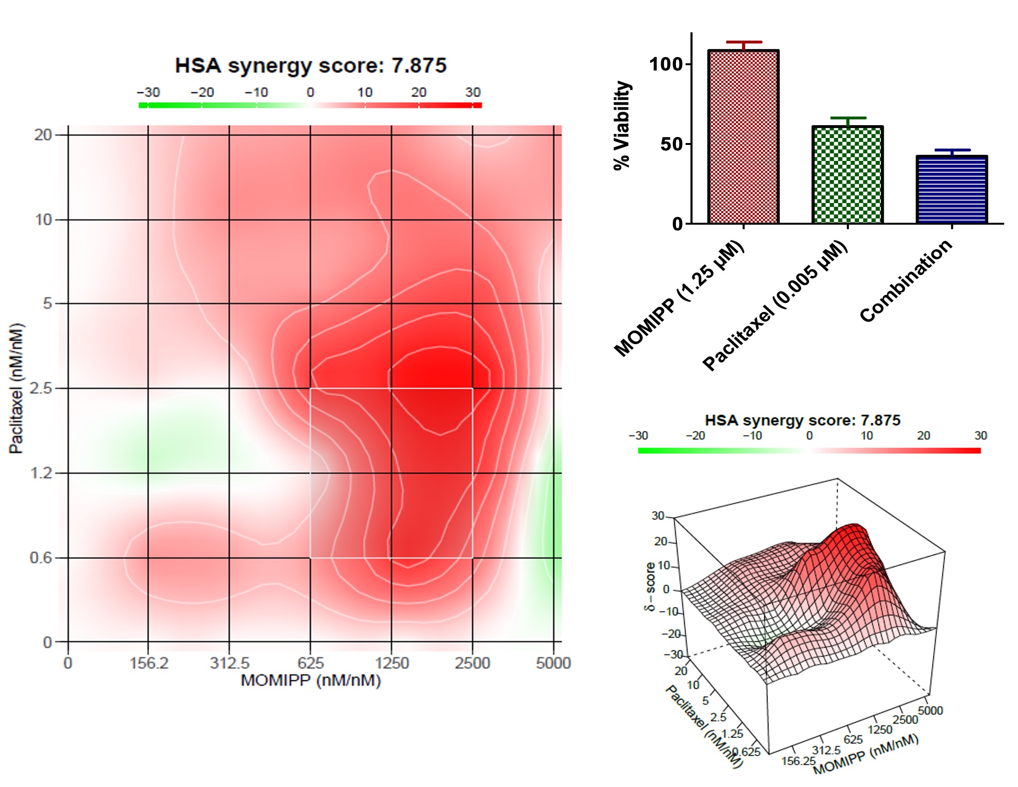 Figure1: Synergy plots based on viability of SUM159 cells incubated with MOMIPP combined with Paclitaxel over 72 h following sulforhodamine B (SRB) assay. MOMIPP enhanced the uptake of the paclitaxel drug via macropinocytosis into the SUM159 cells inducing better cytotoxicity with average synergy score of 7.8 (Two independent experiments, each performed in triplicate.)