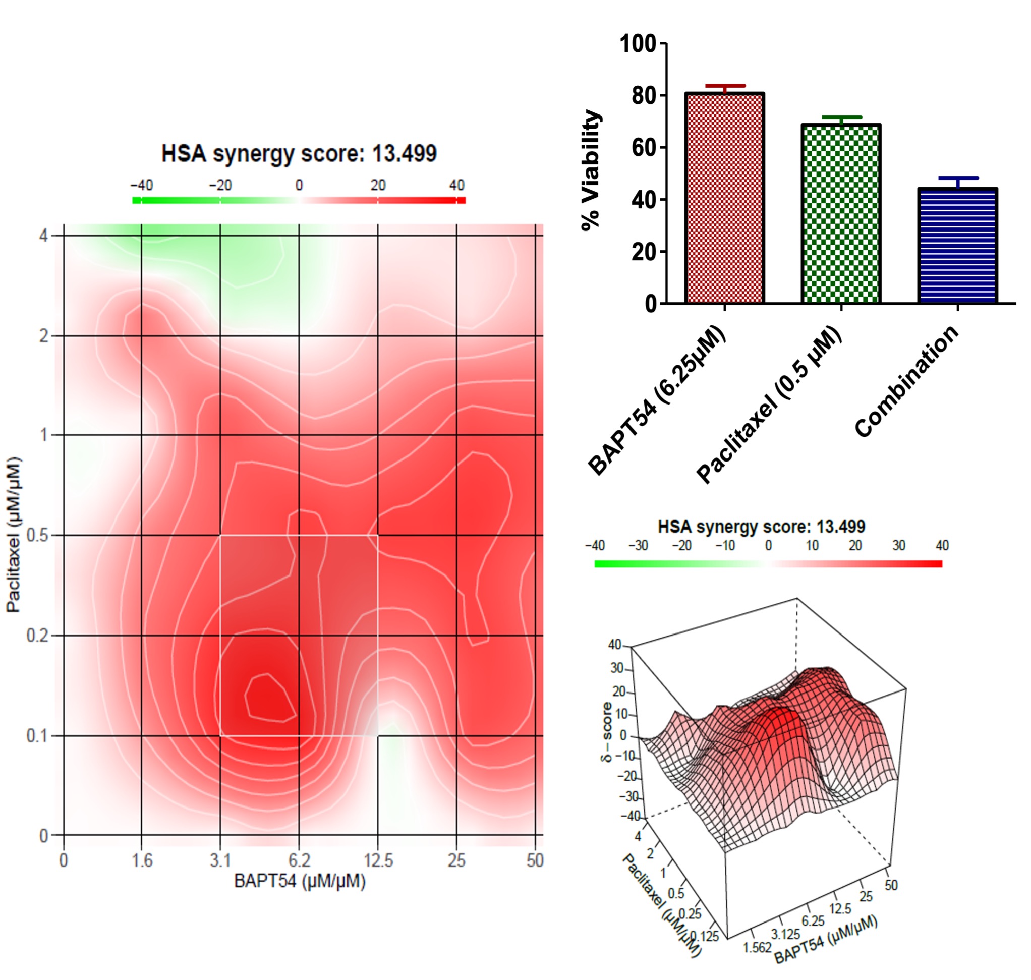 Figure 2: Synergy plots based on viability of paclitaxel resistant variant of SUM159 cells (PAC200) incubated with BAPT54 combined with Paclitaxel over 72h following sulforhodamine B (SRB) assay. BAPT54 enhanced the uptake of the paclitaxel drug via macropinocytosis into the PAC200 cells inducing better cytotoxicity with overall synergy score of 13.49. (Two independent experiments, each performed in triplicate.)