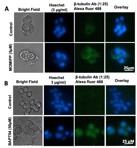 Figure 3: Uptake study of β-tubulin antibody modulated by macropinocytosis inducers (MOMIPP, BAPT) in cancer cells. A: - HCT116 cells incubated with macropinocytosis inducer, MOMIPP, and fluorescent labelled β-tubulin antibody over 6 h, compared to control (without MOMIPP). B: - SW620 cells incubated with macropinocytosis inducer, BAPT54, and fluorescent labelled β-tubulin antibody over 6 h, compared to control (without BAPT54). Higher green fluorescence in cells incubated with macropinocytosis inducers compared to control indicates the uptake of antibody is facilitated by macropinocytosis inducers via macropinocytotic routes.