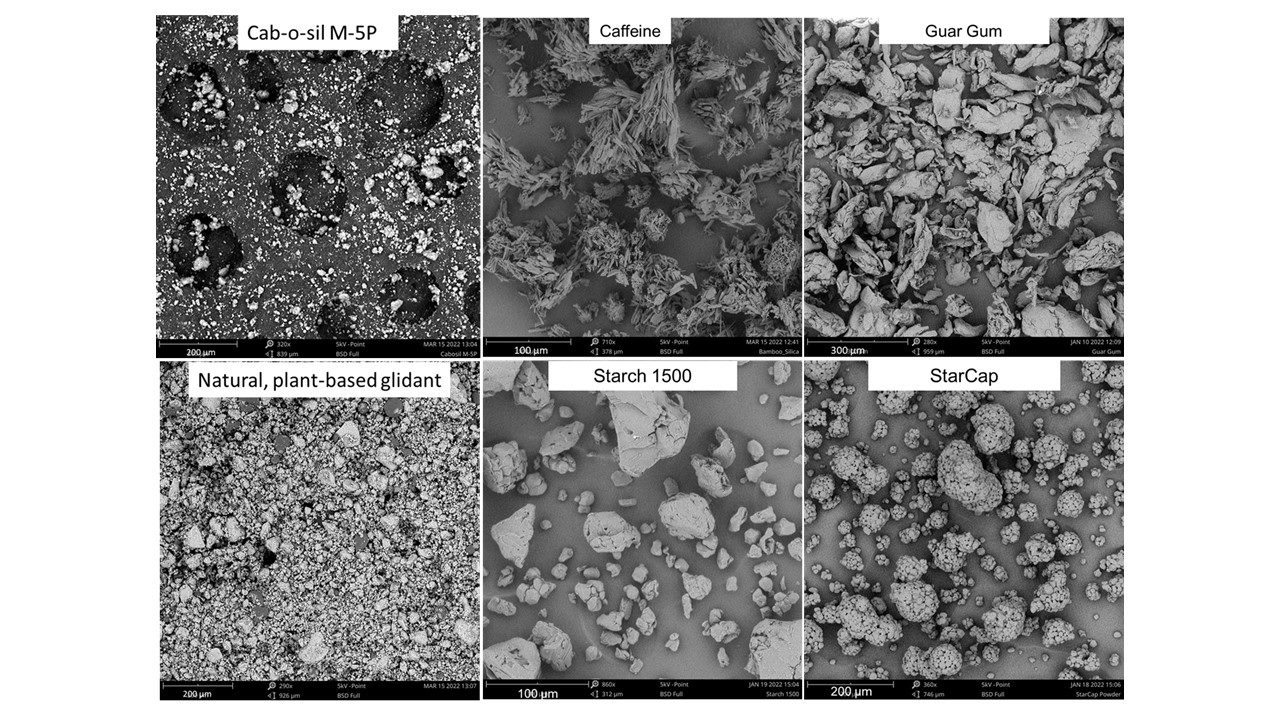 Purpose: The handling of many powders that are used in the nutraceutical industry can be challenging due to their poor flow properties, cohesiveness and stickiness. Therefore, glidants such as colloidal silicon dioxide are commonly added to nutraceutical powders to enhance their powder flow and reduce cohesion. Various grades of synthetic silicon dioxide are commonly used but they are not considered label-friendly. In the nutraceutical supplement sector, consumer desire for products containing natural and label-friendly ingredients has been growing. Hence, there is a need for efficient clean label natural excipients including glidants. In this study, the performance of a natural plant-based glidant and a commonly used synthetic glidant, Cab-o-sil M-5P were compared. Four model materials with different powder flow rates were evaluated for their physical and morphological properties. Methods: Four model powder materials: caffeine anhydrous; guar gum; Starch 1500®, partially pregelatinized maize starch and StarCap®, superior flow maize starch were studied. Binary blends of glidant and each model powder were prepared at 1, 2 and 4% w/w inclusion levels by mixing for 3 minutes. The surface morphology of both glidants and the four model materials was examined using scanning electron microscopy (SEM) at 5 kv. Particle size distribution (PSD) was determined using a laser diffraction system, Malvern Scirocco 2000. Samples were measured at 2 bar and 50% feeding rate where the obscuration was maintained between 5 – 10 %. Powder flow of the pure materials and the binary blends were characterized in terms of flowability index and angle of repose using Flodex™ instrument and Hosokawa Micron Powder Tester (PT-X). Flodex testing was performed following Hanson’s method1. The smallest disk hole in millimeters to allow the powder to fall through three consecutive times is considered as the flowability index. The smaller the flowability index, the better the flow. Flodex testing was performed for all binary blends (1, 2 and 4% w/w) while the angle of repose measurements was determined only for the 1% w/w inclusion level (n=2). Results: The SEM images (Figure 1) depicted that the plant-based glidant and Cab-o-sil M-5P had mostly round morphology with small geometric particle size. The four model powders were shown to have varying surface morphology. Caffeine anhydrous had needle crystalline structure in an aggregated form. Guar gum had fibrous nature while Starch 1500 had a non-uniform shape with non-porous structure. On the other hand, StarCap had spherical shape that demonstrated a porous structure. The plant-based glidant had a comparable average particle size to Cab-o-sil M-5P. Among the four model powders, caffeine anhydrous had the smallest average particle size of 7.0 µm and Starch 1500 had the largest size of 97.0 µm. StarCap and guar gum had average particle sizes of 73.4 and 78.9 µm, respectively. The flowability indices of the four model powders were inversely proportional to their average particle size. Caffeine anhydrous with the smallest particle size had the highest flowability index of 40. This was followed by StarCap, guar gum and Starch 1500 with flowability indices of 26, 22 and 14, respectively. The addition of the plant-based glidant (Figure 2) at 1% w/w resulted in comparable enhancement in powder flow to Cab-o-sil M-5P for all four model powders. Increasing the glidant inclusion level at 4% did not have much affect the flowability indices of caffeine anhydrous and StarCap, but significantly deteriorated the powder flow of guar gum and Starch 1500 as shown in Figure 2. Similar to Cab-o-sil M-5P the plant-based glidant enhanced the angle of repose powder flow property of all four model powders (Figure 3). Needle-structured caffeine anhydrous had the highest angle of repose of 56.9°, indicating a very poor powder flow property based on the USP < 1174 > angle of repose classification2. The two glidant grades enhanced the powder flow of caffeine from the very poor to the poor category. The angle of repose for guar gum was improved from passable/poor to fair whereas StarCap was enhanced from fair/passable to good. Starch 1500 presented the only discrepancy between the two glidant grades with the plant-based grade enhancing the powder flow of Starch 1500 from fair to good rather than remaining fair for Cab-o-sil M-5P. Conclusion: The natural, plant-based glidant enhanced the flow properties of all tested model powders mainly at 1% w/w inclusion level. The plant-based glidant demonstrated the same efficiency as one of the most commonly used synthetic glidants, Cab-o-sil M-5P. Hence, it is concluded that a clean-label natural glidant can replace the use of synthetic glidants in the nutraceutical sector, increasing consumers satisfaction. References: 1. https://files.hansonresearch.com/wp-content/uploads/2019/06/21101000-E-Flodex-Operation-Manual.pdf 2. https://www.usp.org/sites/default/files/usp/document/harmonization/gen-chapter/g05_pf_30_6_2004.pdf