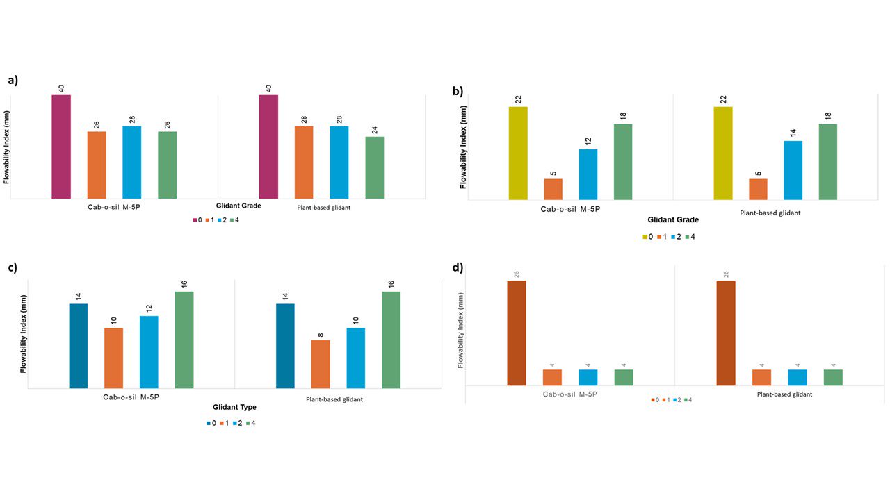 Figure 2: Effect of the Glidant Grade and the Inclusion Level on the Flowability Index of a) Caffeine Anhydrous, b) Guar Gum, c) Starch 1500 and d) StarCap