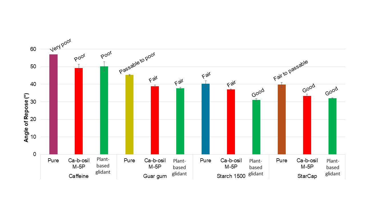 Figure 3: Effect of Plant-Based Glidant and Cab-o-sil M-5P on the Angle of Repose of Four Model Powders. The angle of repose USP powder flow category for each sample (average ±standard deviation) is summarized on the top of each charted column.