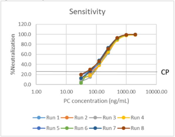 Purpose: There has been a rapid growth in the investigation of Adeno-associated virus (AAV)-based gene therapeutics in the past decades. Viral vectors packaged with genetic material are delivered to targeted cells in human patients for the expression of therapeutic proteins. However, pre-existing and treatment-induced/boosted neutralizing antibodies can significantly impair viral transduction and, by extension, impact drug efficacy. This work focused on the de novo development and validation of a flow cytometry (FC) assay for the detection of neutralizing antibodies (NAbs) against AAV5. Methods: During initial feasibility stage, multiple platforms and vendors were evaluated to select a system that can provide good potency of viral transduction into the cell line. Fluorescence readout using a plate reader was tested first, but resulted in high background with no distinct potency curve. Therefore a flow cytometry approach was considered. Two models of flow cytometers, a Novocyte Quanteon (model 1) and a FACS Canto II (model 2) were compared. The Quanteon (model 1) showed superior sensitivity and signal-to-noise (S/N) > 20, compared to Canto (model 2), which has a S/N of 2 (Figure 1). In addition, a clear separation of negative and positive population can be seen from the Quanteon plot, which allows for %GFP+ gating (Figure 3a). Compared to traditional MFI (mean or median), %GFP output provides better reproducibility and robustness for this assay. The principle of the fully developed FC method is as follows: continuously cultured cells are plated on the day of assay. Samples and controls are incubated with AAV5-GFP for antibody-drug interaction. After that, the sample/virus mixture is loaded onto the cell plate and incubate for 2 days. After incubation, the cells are harvested and acquired on the flow cytometer for the measurement of GFP expression. Results: The FC Nab assay was successfully validated with optimal results. Due to the incidences of pre-existing antibodies in human serum, negative base pool and cut point lots were pre-screened to have an antibody naïve population. Parametric assay cut point was derived from data points generated from six runs by two analysts. Subsequently, sensitivity was determined from eight curves generated by two analysts. An average cut point interpolation at 61 ng/mL of PC antibody and an assay sensitivity of 90 ng/mL was achieved with great titer precision (Figure 2). Precision runs were carried out by two analysts over six plates, and inter- and intra-assay precision for all levels of controls were within acceptability (25% CV) parameters for both raw %GFP and %Neutralization (Figure 3b). Evaluations of drug tolerance, selectivity, stability and robustness all met acceptance criteria. Conclusion: Flow cytometry platform combined with %GFP output greatly improved dynamic range and sensitivity of the neutralizing antibody assay for AAV5. The method was successfully validated, and is in active use for analysis of clinical samples. A similar approach can be employed to develop and validate Nab methods against other serotypes of AAV or for other types of gene therapy products utilizing viral vectors.