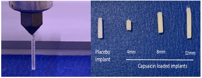 Figure 1. Fabrication of capsaicin-loaded rod-shaped implants by means of thermoplastic extrusion-based 3D printing technology.