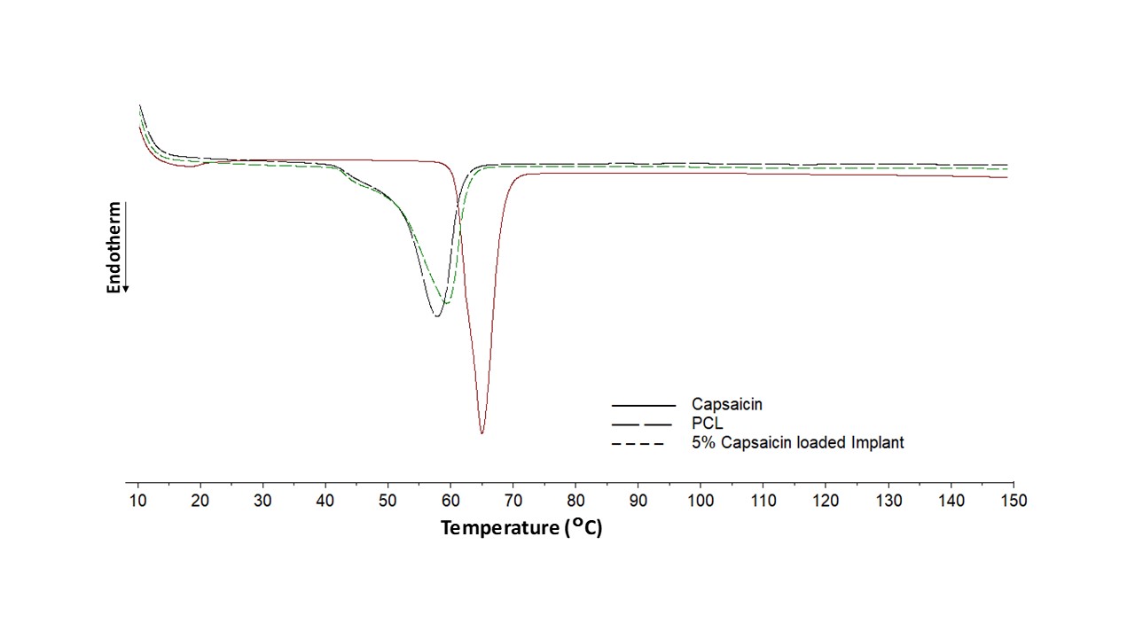 Figure 2. DSC curves of pure capsaicin, PCL polymer, and 5% capsaicin-loaded polymeric implant.