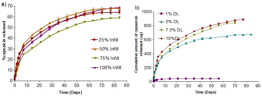 Figure 3. In vitro release of capsaicin from 3D printed implants a) printed with different infill densities (25%, 50%, 75%, and 100% infill); b) Cumulative amount of capsaicin released from different concentrations of drug-loaded implants (n=4)