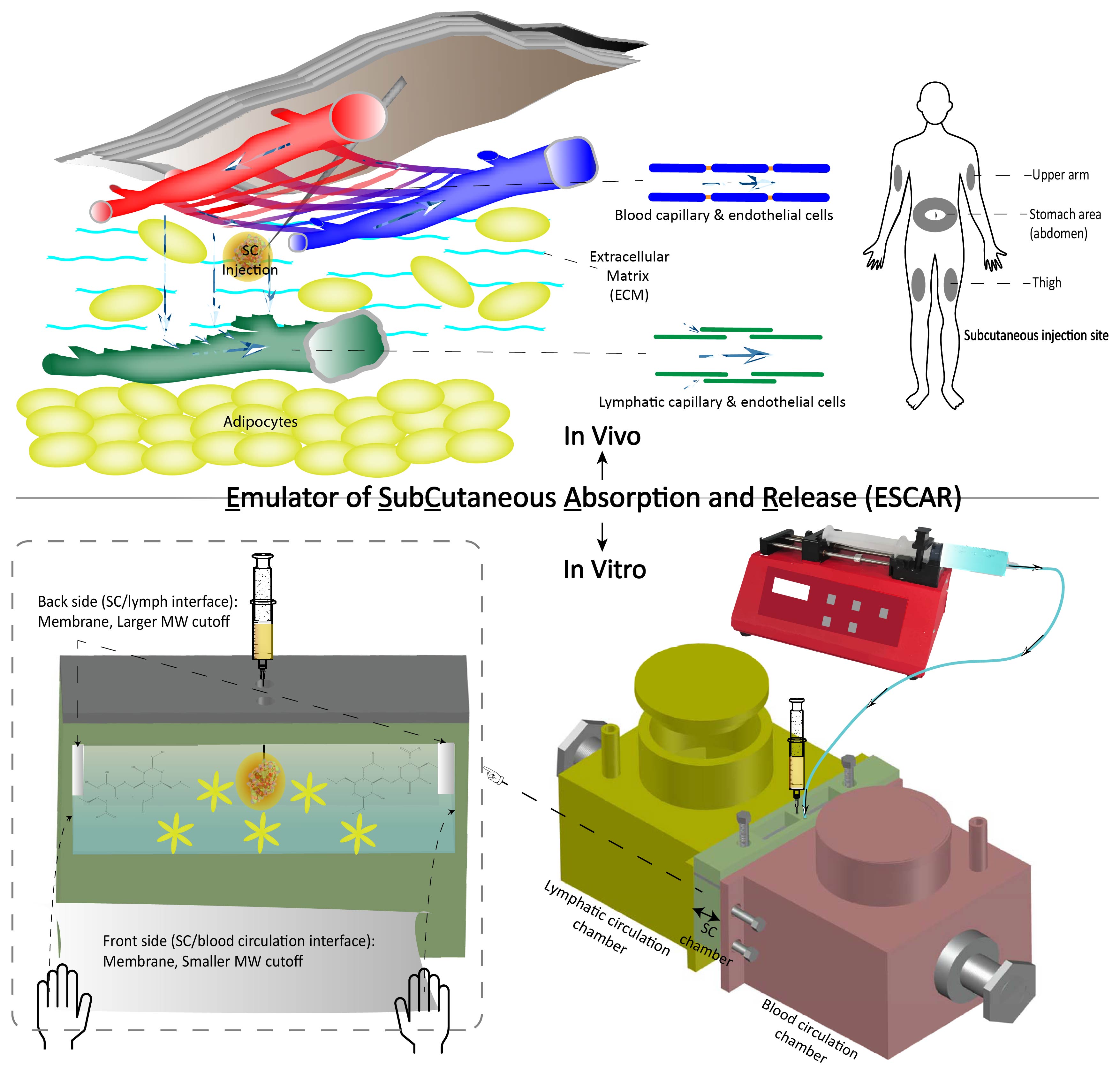 Purpose: A reliable in vitro system can support and guide the development of subcutaneous (SC) drug products. This study sought to develop a novel in vitro system, namely Emulator of SubCutaneous Absorption and Release (ESCAR), to better emulate the in vivo SC environment and predict the fate of drugs in SC delivery. Methods: ESCAR was fabricated with the aid of Computer-Aided Design (CAD) and 3D printing technique. The fabricated device was used to evaluate different molecules and formulations. A DoE factor screening study was conducted to identify critical parameter(s), and the obtained DoE data was modeled by a variety of machine learning-based methods and Monte Carlo simulation-based methods. An in-vitro-in-vivo correlation (IVIVC) study was developed to explore the feasibility of applying ESCAR in formulation development and bioequivalence studies. Results: The results of the factor screening study suggested that hyaluronic acid (HA) concentration was a critical parameter for drug release, whereas the influence of injection volume and injection position was not substantial. Further, drug uptake from the “SC” chamber to the "blood circulation" chamber could be modeled by a variety of methods, including polynomial equations, machine learning methods, and Monte Carlo simulation-based methods. Notably, all machine learning models (SVM, RF, gradient boosting, and MLP) had higher R2-score values than polynomial equations, suggesting that the training data was fit better by the machine learning models. The data cross-validation also suggested that all developed machine learning models could learn the training dataset and have good generalization power for new data. The developed LEVEL-A IVIVC model demonstrated that the in vivo PK profile could be correlated to the in vitro release profile. As a result, the model passed the internal validation, and the average absolute internal %PE for Cmax was 3.6%, and for AUC0-24hr was 2.9%. In addition, to make the model more conclusive, the external validation was performed, and the %PE values for Cmax and AUC0-24hr were 14.9% and -11.5%, respectively. Further, the parameter sensitivity analysis (PSA) results pointed out that the PK profile was highly sensitive to PK parameters k10 and Vc. Using this IVIVC model, for a new griseofulvin suspension formulation, only in vitro release tests would need to be conducted in ESCAR, and costly and time-consuming in vivo studies might be waived. Conclusion: In this study, a prototype of an in vitro system ESCAR was developed to emulate the in vivo SC environment. ESCAR showed its potential uses in the assessment of different SC formulations (e.g., solution and suspension) and small-molecule drugs (e.g., hydrophilic and hydrophobic molecules). The established IVIVC model demonstrated that ESCAR had important implications in SC drug product development and bioequivalence studies. References: Chiang P-C, Nagapudi K, Fan PW, Liu J. Investigation of Drug Delivery in Rats via Subcutaneous Injection: Case Study of Pharmacokinetic Modeling of Suspension Formulations. Journal of Pharmaceutical Sciences. 2019;108(1):109-19.