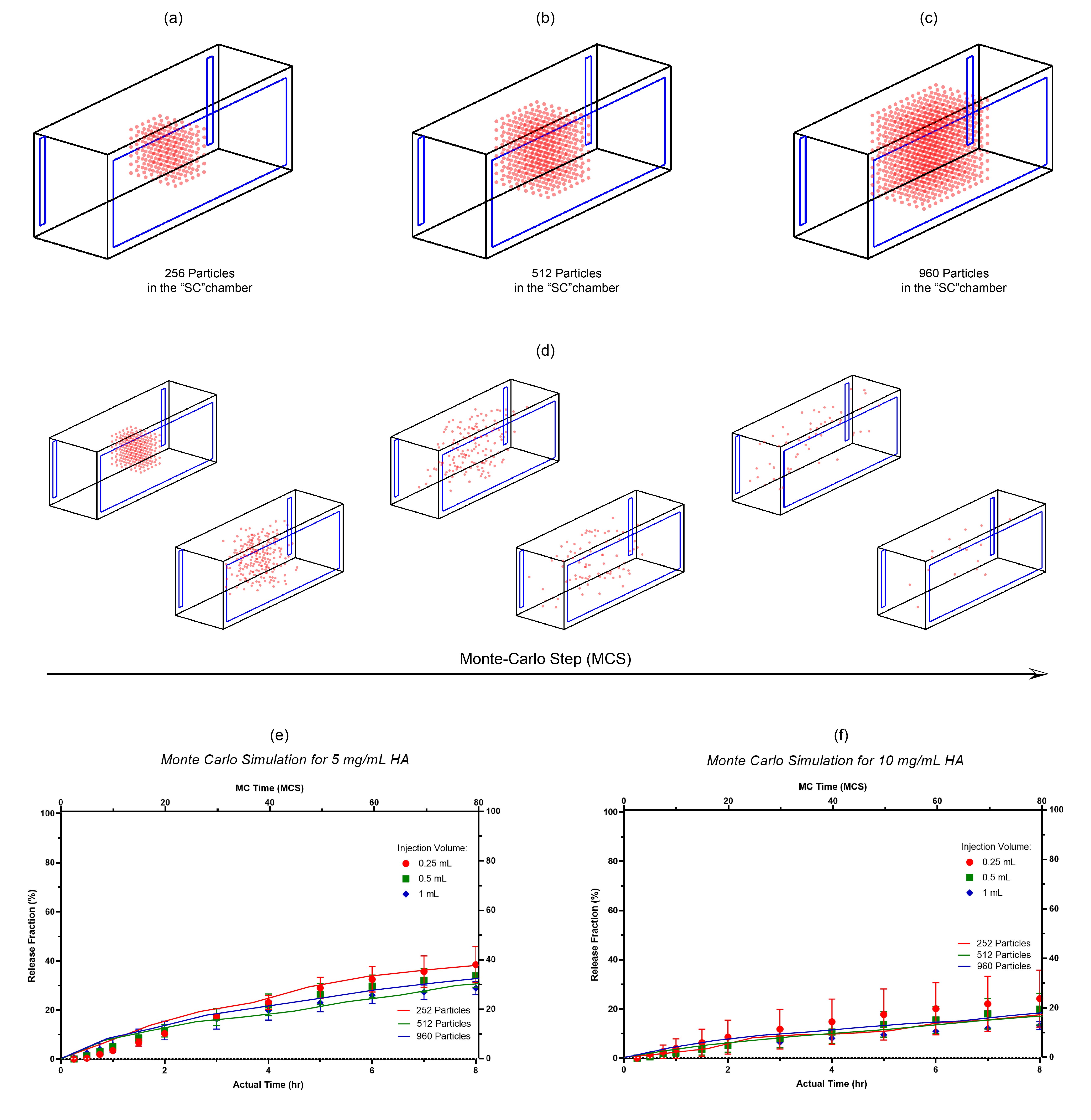 Monte Carlo simulation of drug release from the “SC” chamber: (a) the insertion of 256 particles into the chamber; (b) the insertion of 512 particles into the chamber; (c) the insertion of 960 particles into the chamber; (d) particle migration inside the chamber as a function of arbitrary time unit (MCS); (e) the correlation between the simulation data (q: 0.45) and the actual data (release medium: 5 mg/mL HA solution); (f) the correlation between the simulation data (q: 0.8) and the actual data (release medium: 5 mg/mL HA solution).