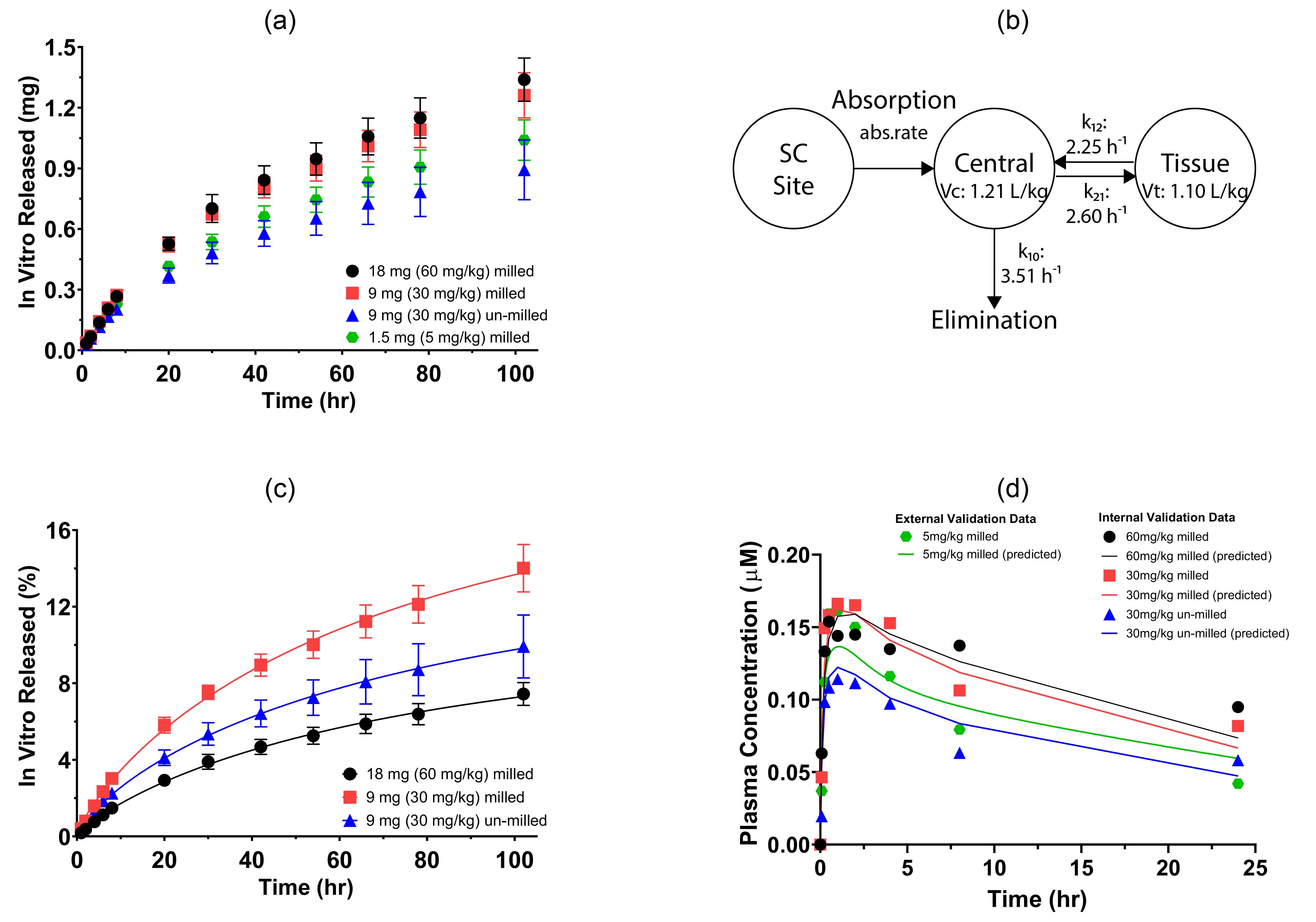 In-Vitro-In-Vivo Correlation (IVIVC) model development: (a) in vitro release profile (mg) obtained from ESCAR; (b) the two-compartment PK model for the SC administration of griseofulvin suspension; (c) in vitro release profile (%) obtained from ESCAR; (d) predicted and experimental plasma concentration profile.