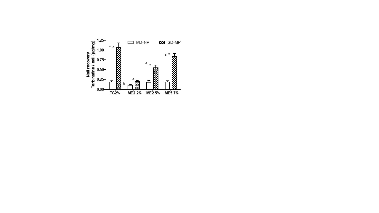 Fig. 2. Mean (±SD, n=4) TER recovered from fingernail clippings after IVPTs with thermogel (TG) and microemulsion (ME) formulations. (*) significant (p≤0.05) effect of poration; (a) significantly different (p≤0.001) to all other formulations in SD-MP; (b) significantly different (p≤0.02) to ME5 7% and TG2% in MD-NP