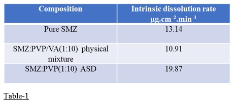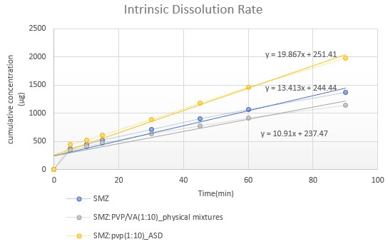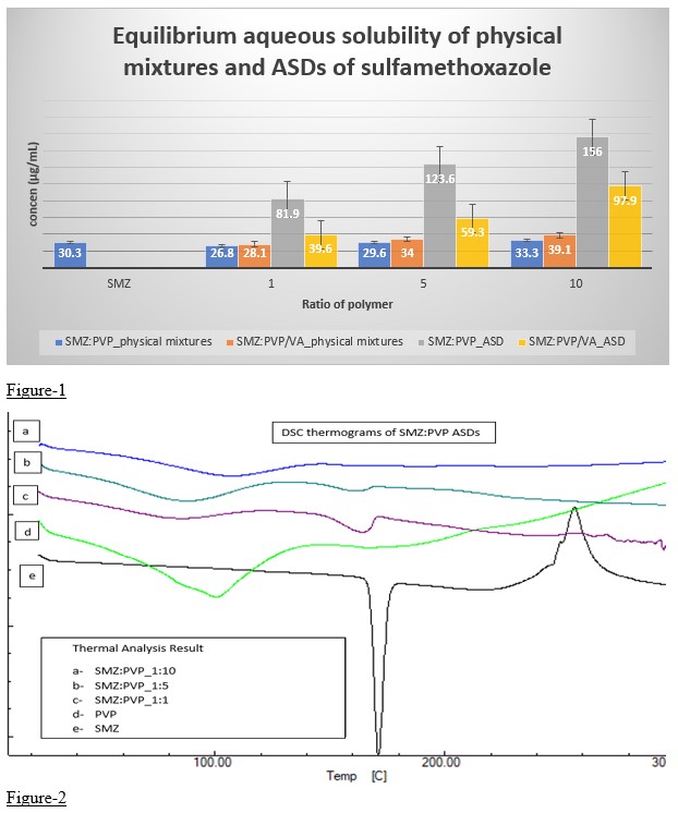 Purpose: About 90% of the new chemical entities in the discovery pipeline and 40% of the market approved drugs are poorly water soluble and these solubility issues hinder their development as oral therapeutic agents. The intrinsic dissolution rate (IDR) studies will help to assess the developability of these compounds into potential products. The present study focuses on evaluating the solubility behavior of sulfamethoxazole (SMZ) and its amorphous solid dispersions (ASDs) using equilibrium solubility and intrinsic dissolution studies. Methods: Preparation of sulfamethoxazole ASDs - The ASDs and physical mixtures of SMZ were prepared in varying ratios of Polyvinyl pyrrolidone K29/32 polymer (1:1,1:5,1:10 w/w). Similarly, physical mixtures and ASDs of SMZ and polyvinyl pyrrolidone-co vinyl acetate were also prepared at the same ratios. Equilibrium aqueous solubilities of the prepared compositions of physical mixtures and ASDs equilibrium aqueous solubility was determined. Sulfamethoxazole ASDs were prepared by Hot melt method using polyvinyl pyrrolidone (PVP) and poly vinyl pyrrolidone co vinyl acetate (PVP/VA) polymers. The ASDs were prepared by mixing the weighed amount of the API and polymer and were mixed and heated in a porcelain crucible until molten. This molten mass was cooled and pulverized using mortar and pestle and passed through sieve with 40 number mesh.Physical mixtures were prepared by mixing the API and the polymer and grinding in mortar with pestle. This mixture was sieved through a 40 number mesh to obtain uniform particle size. Characterization by Differential scanning calorimetry (DSC)- Both the ASDs and physical mixtures of SMZ were characterized by DSC using aluminum pans at a temperature ramping of 10ºC per minute in nitrogen atmosphere. All the samples were analyzed over the temperature range of 25 ºC - 500 ºC. Equilibrium aqueous solubility- The equilibrium aqueous solubility of the pure API, physical mixtures and the ASDs of SMZ were determined using Shake flask method. Weighed amount of each physical mixtures and ASDs containing an equivalent amount of API were added to glass vials and 5mL of water was added. The vials were vortexed for 30 seconds to disperse the contents and were set for shaking at 25ºC for 24hours. Later, 0.5mL of sample was aliquoted and transferred to a centrifuge tube with 0.45µm cellulose acetate filter and were centrifuged at room temperature for 5 mins at 14000 rpm. Once centrifuged 0.1 mL of the filtrate was drawn and 0.9mL of water was added and were analyzed for the API content by HPLC. Intrinsic dissolution rate (IDR) studies-IDR studies were conducted using rotating disk system. This rotating disk has a die and punch to compress the sample and the die is fixed to the shaft. The dissolution medium was 0.1N Hydrochloric acid. The speed maintained was 75 rpm. Dissolution media samples were collected until 10% of the API in the die was released. The cumulative amount of the API released was plotted against time. The slope of the regression equation gives the dissolution rate in µg.min-1.cm-2. The compositions that exhibited significant enhancement in solubility were chosen for the IDR studies to observe whether the same trend as in equilibrium solubility was maintained. Results: The ADSs of SMZ:PVP(1:10w/w) has exhibited 5-fold increase in equilibrium aqueous solubility when compared to pure SMZ (Fig-1). The P-value obtained by two tailed paired t-test was 0.0001, which shown to be statistically significant. The DSC data showed the amorphous nature of the SMZ (Fig-2) in SMZ:PVP (1:10) ASDs. The intrinsic dissolution rate of SMZ:PVP(1:10 w/w) was 19.87 µg.cm-2.min-1 when compared with 13.41 µg.cm-2.min-1 for pure SMZ. The slope of the linear regression equation of the cumulative concentration vs time graph represents the intrinsic dissolution rate (Fig-3). Conclusion: The ASDs of SMZ:PVP have exhibited significant increase in the equilibrium solubility, whereas the ASDS of SMZ prepared with PVP/VA did not show any improvement. This improvement in the solubility enhancement is due to the amorphous nature of the SMZ in the ASDs. There has been improvement in the intrinsic dissolution rate of ASD when compared to pure SMZ. References: 1. Baghel S, Cathcart H, O'Reilly NJ. Polymeric amorphous solid dispersions: a review of amorphization, crystallization, stabilization, solid-state characterization, and aqueous solubilization of biopharmaceutical classification system class II drugs. Journal of pharmaceutical sciences. 2016 Sep 1;105(9):2527-44. 2. Sareen S, Mathew G, Joseph L. Improvement in solubility of poor water-soluble drugs by solid dispersion. International journal of pharmaceutical investigation. 2012 Jan;2(1):12.