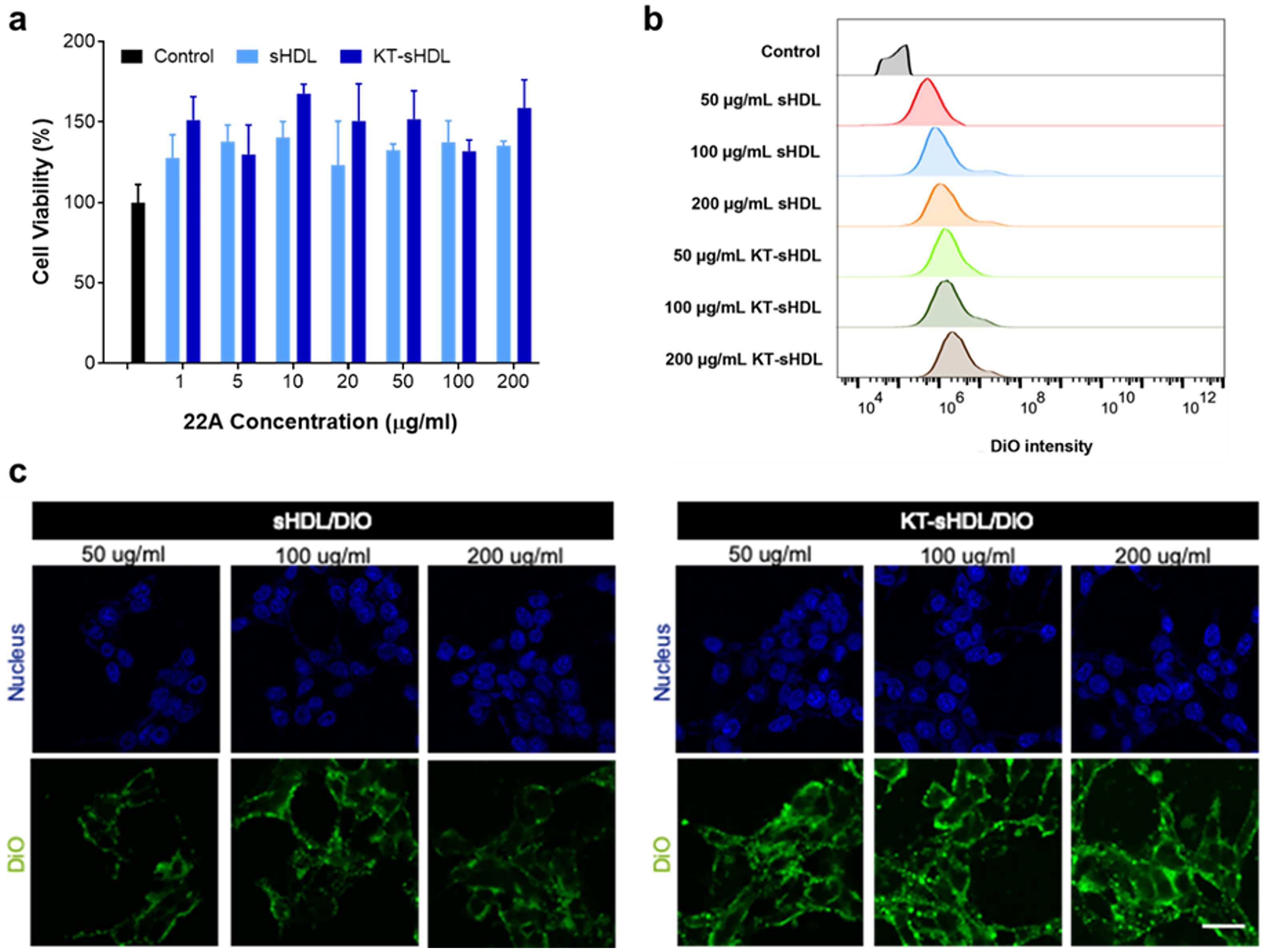 Purpose: Dyslipidemia is recognized to be an important contributor to the progression of diabetic nephropathy (DN), leading to lipoprotein dysregulation, excessive mesangium expansion as well as inflammation in the glomeruli. Thus, dual targeting of abnormal cholesterol metabolism and inflammatory responses of mesangial cells represents an alternative approach for DN treatment. Our strategy for the treatment of DN is to develop a novel synthetic high-density lipoprotein (sHDL) nanoplatform containing 1) A kidney-targeting (KT) peptide on the surface to avoid the glomerular filtration barrier and promote mesangium retention, and 2) A Liver X Receptor (LXR) agonist in the hydrophobic core to promote cholesterol efflux in the glomeruli. This promising approach to deliver LXR agonists with sHDL nanodiscs is expected to support the idea that reducing cholesterol accumulation and inflammation in the glomeruli represents a new therapeutic approach for DN treatment. Methods: sHDL nanodiscs were prepared by dissolving 22A peptide, DMPC, and T0901317 in acetic acid and freeze drying for 24 hours. The resulting sHDL powder was then rehydrated in PBS and reacted with lipid-conjugated KT peptide to form the kidney-targeted nanodiscs. Nanodiscs were characterized for homogeneity and purity using SEC and LCMS. Particle size was determined using DLS and negative stain TEM.Cellular uptake of nanodiscs was monitored in SV40 MES13 murine mesangial cells using sHDL nanodiscs loaded with the fluorescent dye DiO. Cholesterol efflux in mesangial cells was determined by loading cells with tritium-labeled cholesterol and measuring radioactivity counts in media and cell lysates following a 24-hour treatment period. Changes in mRNA and protein expression for downstream targets of LXR agonists were determined via RT-qPCR and western blot. The biodistribution of nanodiscs was determined by administering nanodiscs loaded with the near-infrared dye DiR and imaging mice on an in vivo imaging system (IVIS). A mouse model of DN was established via injections of streptozotocin. Efficacy in vivo was evaluated by monitoring changes in body weight, expression of inflammatory cytokines and cholesterol efflux transporters, and PAS staining of kidney tissue. Results: sHDL nanodiscs loaded with T0901317 and conjugated with the KT peptide (KT-sHDL/T0) showed improved cellular uptake in vitro compared to unmodified nanodiscs. Treatment of murine mesangial cells with KT-sHDL/T0 resulted in improved cholesterol efflux, increased expression of the cholesterol efflux transporters ABCA1 and ABCG1, and reduced expression of the inflammatory cytokines TNFα and IL6. KT-sHDL/T0 nanodiscs showed superior accumulation in the kidneys compared to unmodified nanodiscs. KT-sHDL/T0 nanodiscs suppressed mesangial expansion, increased expression of cholesterol efflux transporters, and reduced expression of inflammatory cytokines in vivo. KT-sHDL/T0 nanodiscs demonstrated enhanced safety in vivo compared to unmodified sHDL as indicated by reduced levels of triglycerides and reduced expression of Srebp1 and Fasn Conclusion: In this study, we developed a two-pronged strategy that was capable of meliorating dyslipidemia and inflammation in DN. The results support a potential role for LXR agonists in mitigating the progression of DN through several mechanisms, including reduction of circulating plasma lipids, inhibiting of glomerular lipid accumulation and suppression of inflammatory responses. Moreover, synthetic HDL serves as cholesterol acceptor and has a clear synergistic role with LXR ligands in DN treatment. In addition, the proven clinical safety for sHDL will likely facilitate its clinical translation as a nanocarrier. The future development of precise delivery of LXR agonists by sHDL would be beneficial in different clinical settings while reducing liver accumulation. References: G. Russo, P. Piscitelli, A. Giandalia, F. Viazzi, R. Pontremoli, P. Fioretto, S. De Cosmo, J. Nephrol., 33 (2020), pp. 1001-1008; T. Toyama, M. Shimizu, K. Furuichi, S. Kaneko, T. Wada Clin. Exp. Nephrol., 18 (2014), pp. 201-205 G.L. Bidwell 3rd, F. Mahdi, Q. Shao, O.C. Logue, J.P. Waller, C. Reese, A.R. Chade; Am. J. Physiol. Ren. Physiol., 312 (2017), pp. F54-f64 G. Wang, Q. Li, D. Chen, B. Wu, Y. Wu, W. Tong, P. Huang; Theranostics, 9 (2019), pp. 6191-6208 In vitro cytotoxicity of sHDL and KT-sHDL at different concentrations of 22A peptide in mesangial cells was measured by MTT assay relative to PBS control (a). Alterations in the cellular uptake were characterized by flow cytometry (b). Confocal laser scanning microscopy imaging of sHDL/DiO and KT-sHDL/DiO at different concentrations were observed for 2 h incubation at 37 °C (c).