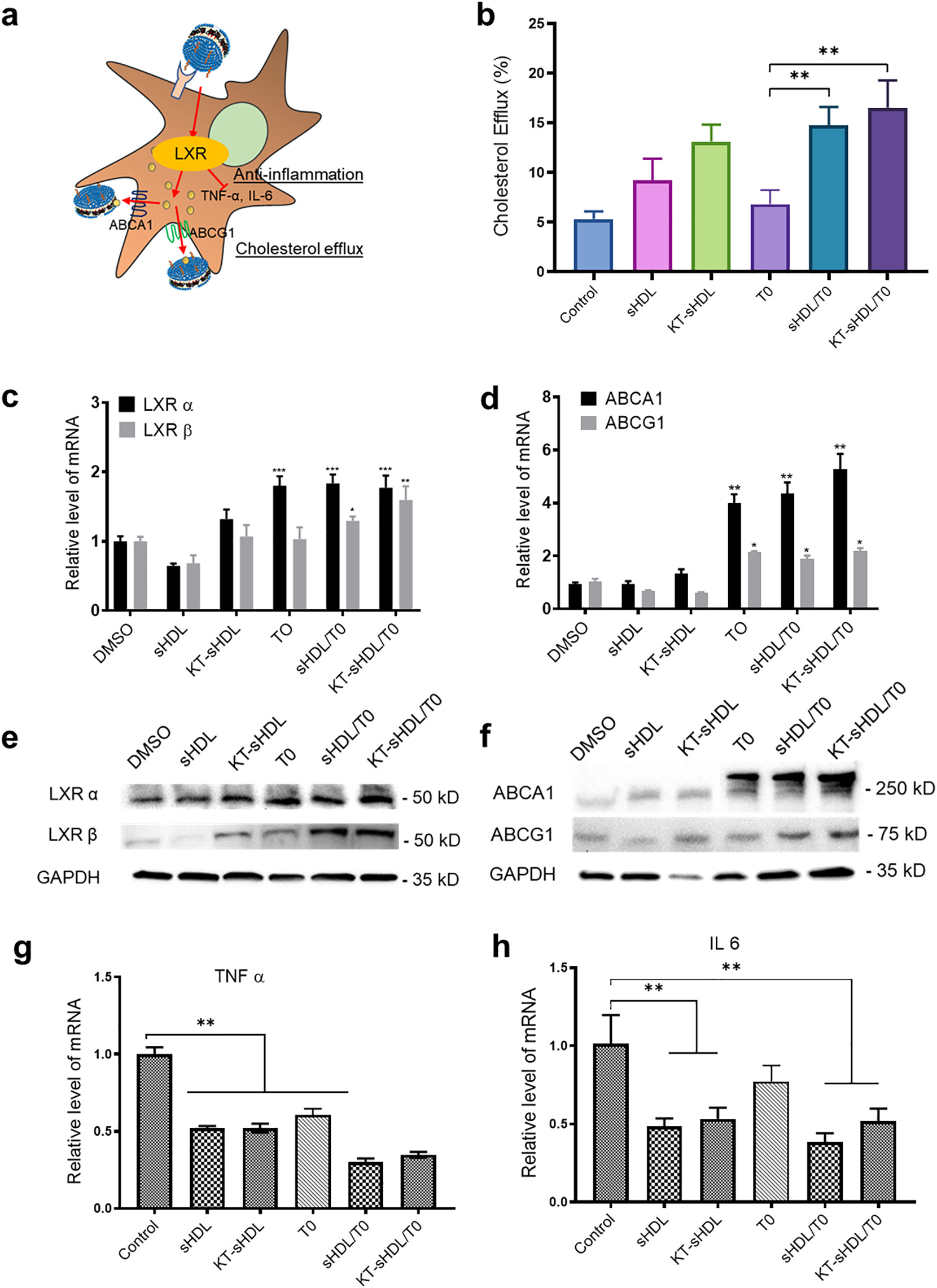 Proposed LXR agonism by KT-sHDLTO on mesangial cell (a). Cholesterol efflux from SV40 MES13 cells was measured as the percentage of [3H]-cholesterol in the medium after 12 h of incubation with free TO (0.1 μM) or different sHDL formulations (10 μg/mL 22A peptide with and without 0.1 μM TO) **p < 0.01 compared to free TO group (b). The expression of LXRα, LXRβ, ABCA1 and ABCG1 were measured by Western blot after 24 h treatment with different formulations(c). RT-PCR was performed for LXR α, LXR β, ABCA1 and ABCG1, and quantification was performed using the ddCt method normalizing to DMSO control, *p < 0.5, **p < 0.01, ***p < 0.001 compared to DMSO control (e, f). SV40 MES13 cell were pretreated with high glucose for 24 h and then incubated with different sHDL formulations for 48 h. Expression of proinflammatory cytokines was determined in each group by RT-qPCR (g,h), **p < 0.01 compared to DMSO control. Data are means ± SD; n = 3–5 per group.