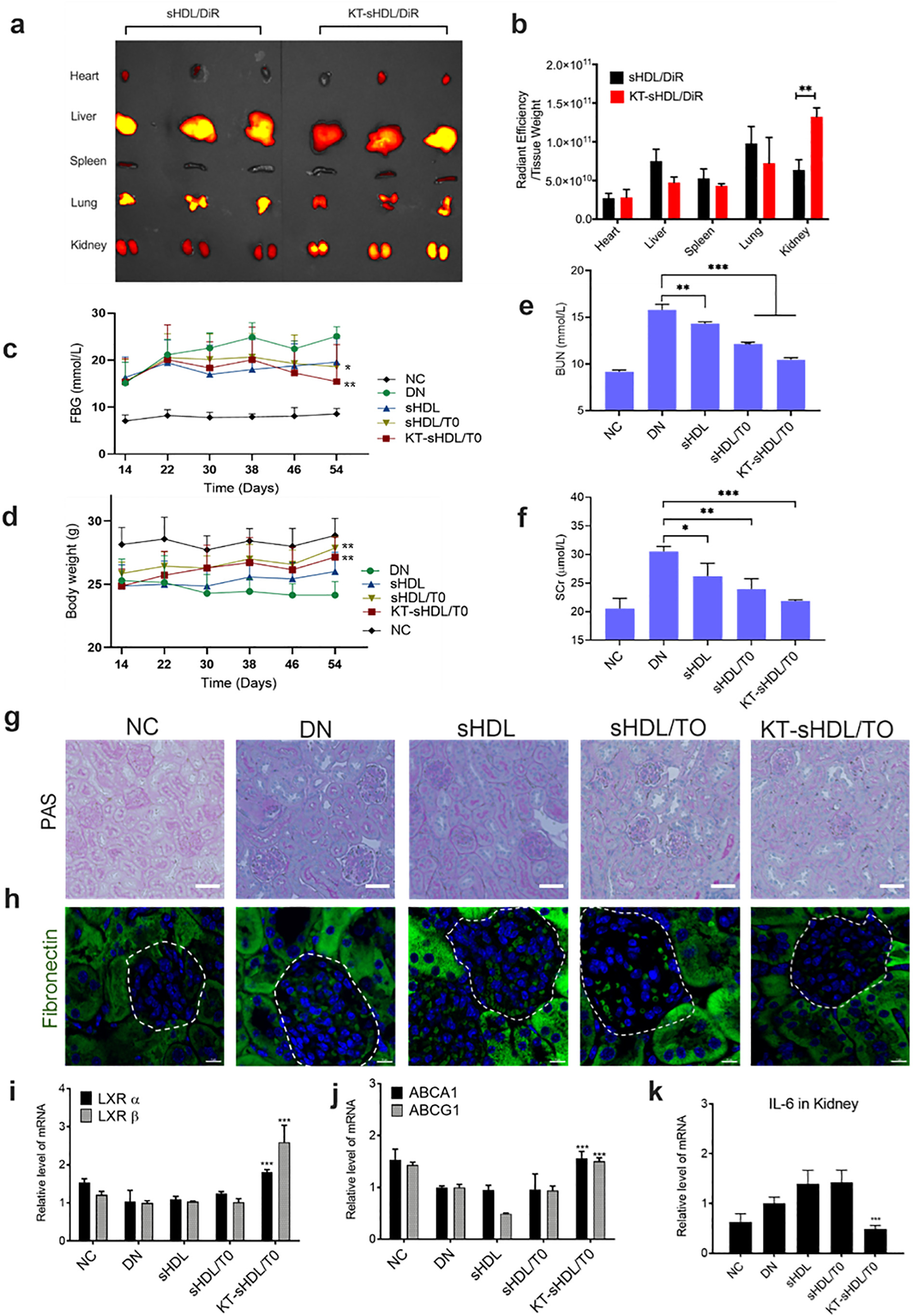 After 12 h I.V. injection of sHDL/DiR and KT-sHDL/DiR in healthy mice, major organs were extracted and images were obtained using IVIS (a). The quantitative analysis of fluorescence intensity in each organ was indicated as the unit of radiant efficiency by using the Living Image software (b). **p < 0.01. Changes in FBG (c) and body weight (d) were displayed in each group during treatment in diseased mice under diabetic condition. At the end of the treatment period, blood urea nitrogen (BUN) and serum creatinine (SCr) of the mice in each group were measured and analyzed (e, f). Representative photographs of glomerular mesangial expansion in mice after different treatment was imaged by PAS staining, scale bar = 50 μm (g). Endogenous fibronectin (FN) expression was detected by immunofluorescent staining for FN (green) and nuclei (blue). Magnification, x63, Scale bar = 10 μm (h). The expression of LXR receptors (i), cholesterol efflux transporters (j) and proinflammatory cytokines (k) were evaluated by RT-PCR analysis. Data were presented as Mean ± SD. Comparison with DN control group, *p < 0.05, **p < 0.01, *** p < 0.005.