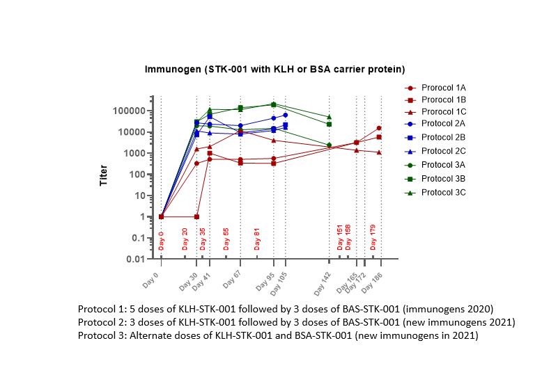 Purpose: STK-001 is a chemically synthesized antisense oligonucleotide that is being developed by Stoke Therapeutics for the treatment of Dravet syndrome in children of age 2 to 18 years. STK-001 is administered intrathecally and is being investigated in Phase 1/2 and Open Label Extension studies in US and UK. To assess the potential immunogenicity response due to ADA generation induced by STK-001 administration in NHP and Human, we developed reliable and sensitive enzyme-linked immunosorbent assay (ELISA) based methods for detection and titration of STK-001 ADA. Methods: STK-001 was conjugated to KLH and BSA for generating immunogens. STK-001 BSA or KLH conjugates were injected to rabbits, using three different protocols and titers were evaluated periodically to monitor for antibody production. Affinity-purification methods were developed and optimized to obtain a high-quality ADA positive control (PC). Various Enzyme-linked immunoassays formats (ELISA/ECL) were compared and investigated for sensitivity and specificity. Reliable ELISA methods meeting regulatory criteria were developed and validated in monkey and human serum. Results: The ADA titers measured by ELISA in rabbit serum showed over 100-fold difference between the three protocols. The highest titers were observed with alternate KLH-STK-001 and BSA-STK-001 administrations (Protocol 3, Figure). The affinity-purification of PC was investigated by using different coating materials. The optimized affinity purification method used Affi-Gel 10 (Bio-Rad) and amino STK-001 for coating, which yielded the highest quality PC. All purifications were conducted under controlled temperature conditions and the yield of positive control was approx. 1%.With purified PC, various Streptavidin coated plates and covalent binding plates were compared to increase sensitivity and to reduce non-specific binding for both ELISA and ECL platforms. A reliable ELISA method with covalent binding surface plate was developed with MRD 25 to monitor ADA in serum. The method was validated for ADA assessments in human and monkey serum. Sensitivity, cut-point, selectivity, titer precision, intra-assay and inter-assay precision, and tolerance were evaluated and met acceptance criteria.The methods are reliable and are being successfully used to support monkey toxicity and human clinical studies. Conclusion: An immunization protocol using alternate injections with KLH-STK-001 and BSA-STK-001 resulted in high antibody titers in rabbits. High quality ADA was purified from serum using an optimized affinity purification protocol, Sensitive and reliable ELISA methods were successfully developed, validated, and used to support monkey toxicity and human clinical studies. Figure: Comparison of ADA Titers in Rabbits for Three Protocols