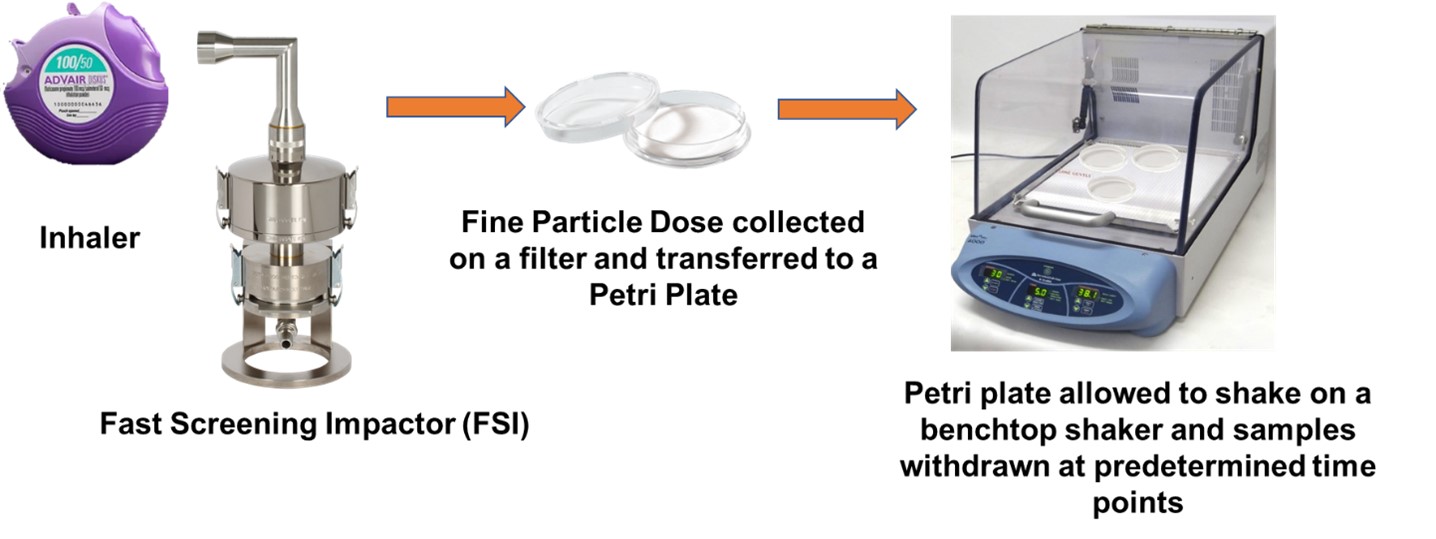 Acknowledgments: Funding for this work was made possible, in part, by the U.S. Food and Drug Administration through Contract HHSF223201810169C. Views expressed in this abstract are from the authors and do not necessarily reflect the official policies of the Department of Health and Human Services, and the FDA, nor does any mention of trade names, commercial practices, or organization imply endorsement by the US Government Figure 1: Schematic of experimental setup and procedure for fine particle dose dissolution testing.