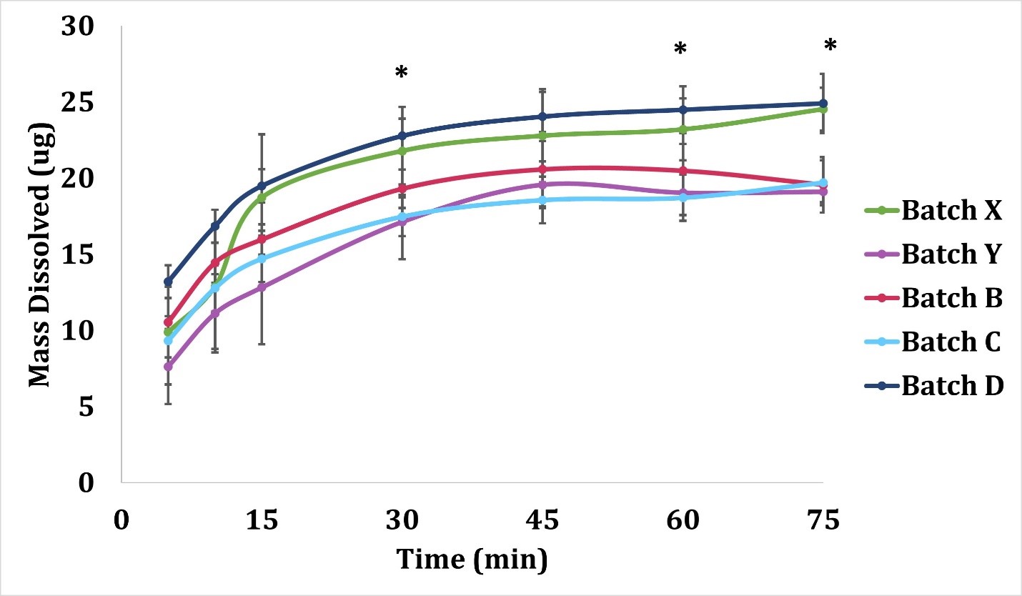 Figure 2: Dissolution time-curve of FP for all batches. Statistically significant (p < 0.05) differences were observed between batches C-D and D-Y at 30 minutes, batches C-D and D-Y at 60 minutes and batches B-D, B-X, C-D, C-X, D-Y and X-Y at 75 minutes. Data are represented as mean ± standard deviation (n=3). *Asterisks indicate significant differences at that particular time point.