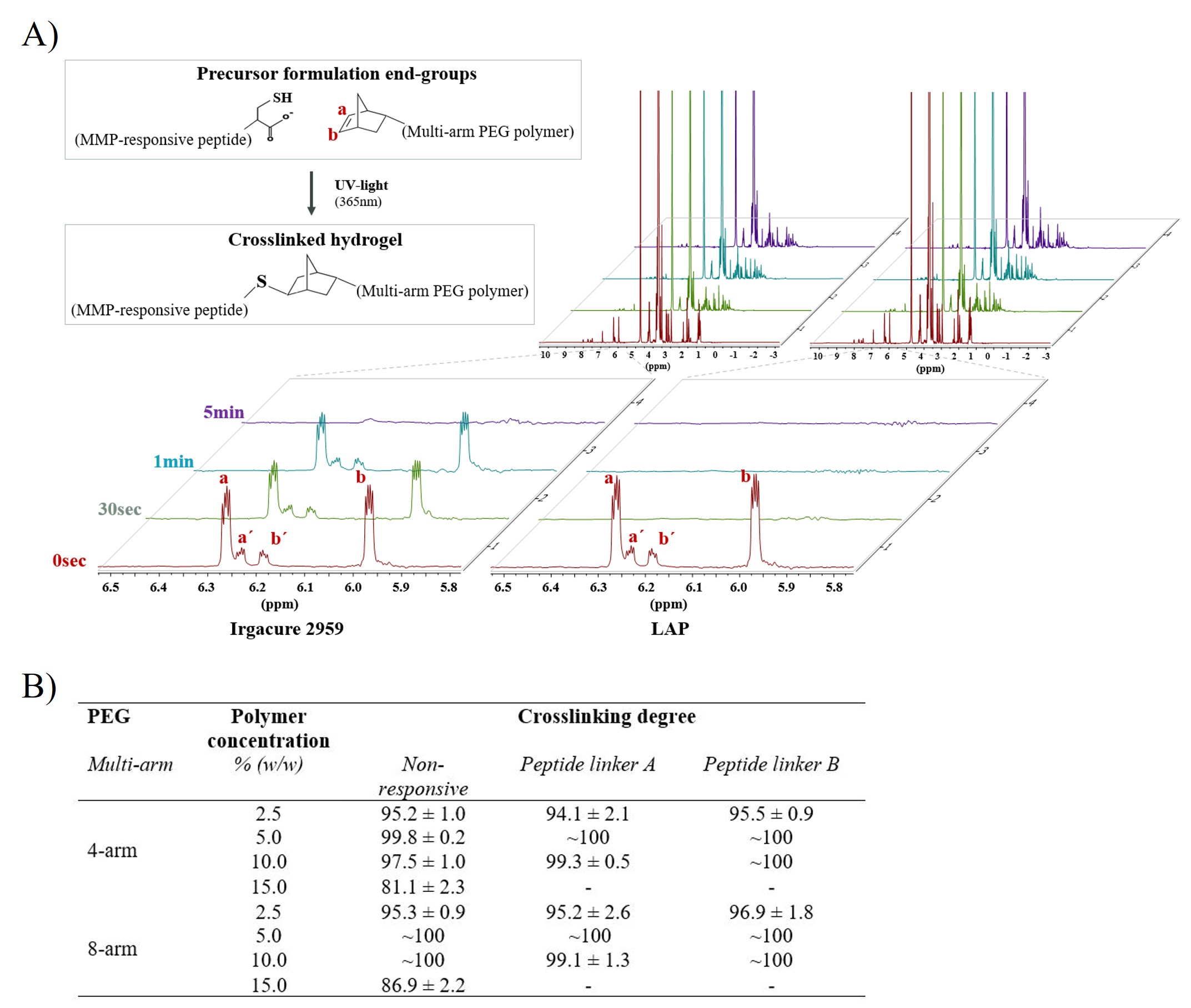 Funding: The work reported in this paper was financially supported by LEO Pharma A/S (2750 Ballerup, Denmark), as well as the LEO Foundation Center for Cutaneous Drug Delivery, University of Copenhagen (Grant number 2016-11-01; AH, MM) Declaration of interest: The authors declare no conflicts of interest. Figure 1. (A) Investigation of cross-linking degree in hydrated PEG hydrogels using 1H HR-MAS NMR spectroscopy. 1H NMR spectra for formulations containing Irgacure (0.05%, w/w) and LAP (0.05%, w/w) are shown. The protons originating from the double bond in norbornene can be detected between 5.95 and 6.30 ppm. (B) 1H HR-MAS NMR spectroscopy results on the cross-linking degree for hydrogels prepared using non-responsive linker, peptide linker A, and peptide linker B. The hydrogels were crosslinked by UV light (365 nm) for 30 s. N = 3.