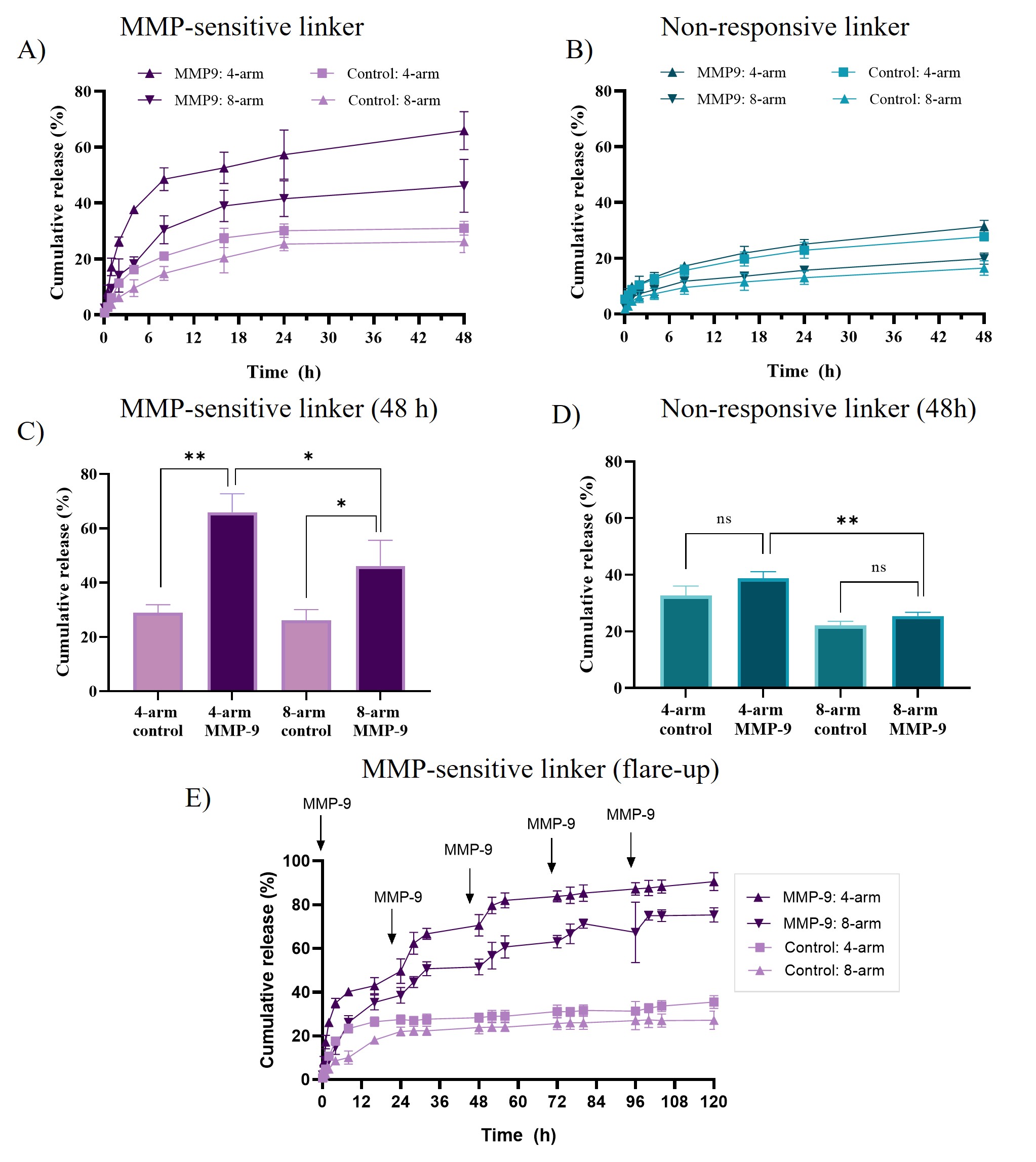 Figure 2. Cumulative release of tofacitinib citrate from 5% (w/w) 4-arm and 8-arm PEG (w/w) hydrogels in PBS at 37 °C without and with 20 nM activated MMP-9, respectively. Results are shown for PEG hydrogels cross-linked with (A) MMP-sensitive linker B and (B) non-responsive linker. The MMP-responsive cumulative drug release is shown after 48 h for hydrogels for (C) MMP-sensitive linker B and (D) MMP-insensitive linker. (E) Cumulative drug release after repeated MMP-9 exposure (↓) of the PEG hydrogels cross-linked with MMP-sensitive linker B. N = 3.