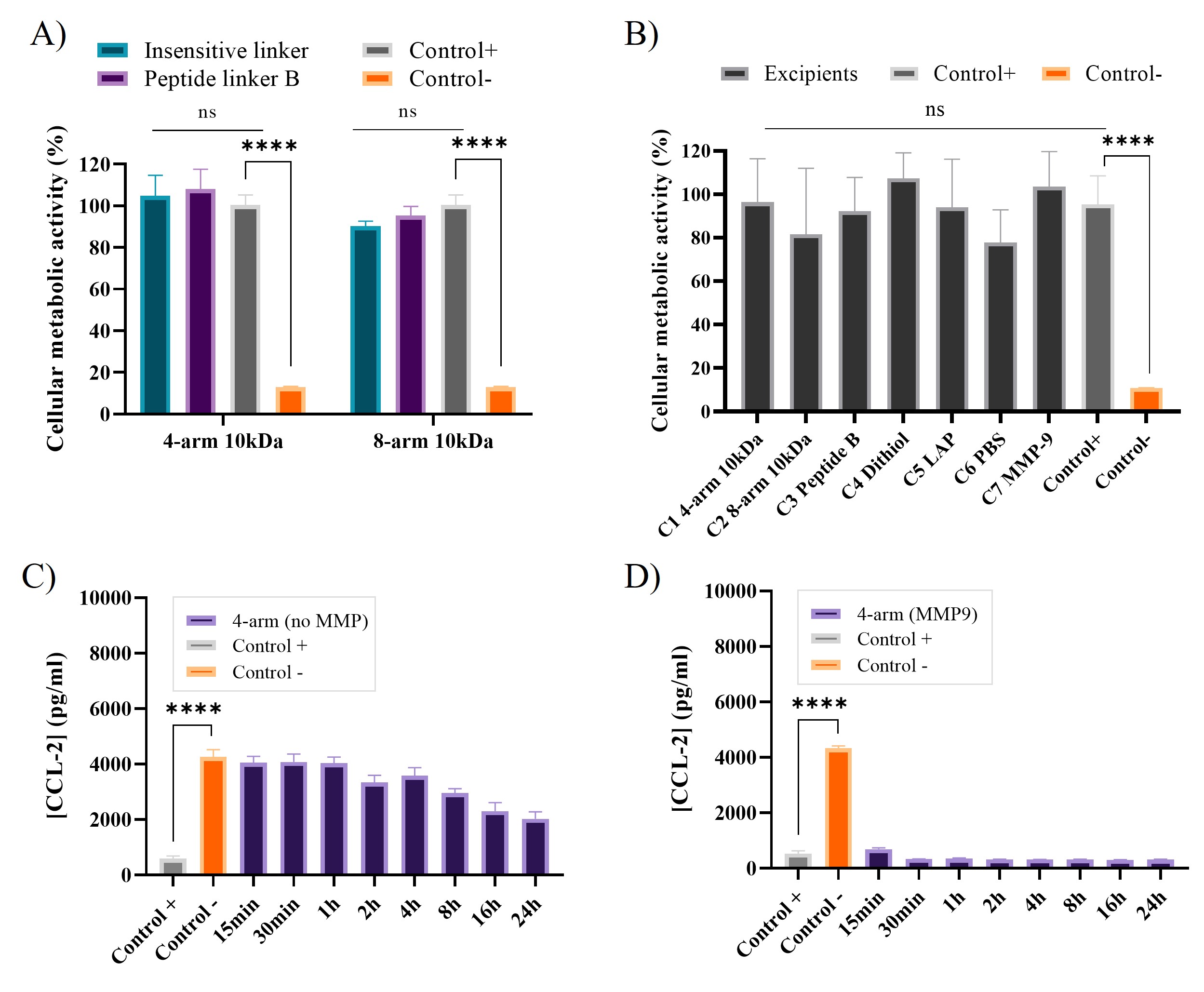 Figure 3. (A) Results obtained from the fibroblast cytotoxicity assay for evaluation of the hydrogel cleavage products after exposure to MMP-9. (B) Corresponding results obtained for separate formulation components. The incubation time for (A - B) was 24 h. Results from the AD-like keratinocyte assay showing the CCL-2 inhibition by tofacitinib citrate at different timeslots. (C) 4-arm hydrogels without MMP-9 stimulus, (D) 4-arm hydrogels exposed to 20 nM MMP-9 stimulus. N = 3.