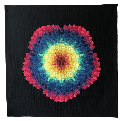 A prism’s function is to change the way we see light; to fracture that light into colors and change the perception of what we see. For me, this is seeing bright colors when I needed a reminder of light in the dark: a stained glass window, a kaleidoscope in the sun, and a fantastical flower that exists only in my mind. Newness is also a theme for me concerning the skills of this quilt: the first large scale English Paper Piecing project I’ve completed, new attempts at machine appliqué and combining free motion quilting and straight line quilting… and the first time the finished colors of a quilt have truly surpassed what I had hoped when planning.