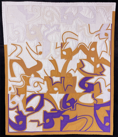 I wanted to give the feeling of an idea coming to life through the creative process. My inspiration came from a picture documenting the process of creating the first quilt in my “Q is for Quilt” series. Working in reverse appliqué, I liked the open spaces that emerged in those early stages, but I didn't want to stop before the original idea was realized. I decided instead to revisit that concept in a new quilt. But as this project moved forward, the golden color dominated the composition. So, a third color was introduced and the piece took on new meaning. Instead of documenting a moment in the process, it became an active comment on how an idea solidifies. In the top left corner, the "Q" is completely white, a hint at an idea. As the eye wanders down to the bottom edge, the shapes take form and become more substantial.