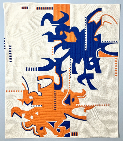 Through the sharing of our creations we are exposed to new skills, techniques and ideas. Often this inspires us to incorporate something fresh into the body of our work. This piece speaks to how quilters and, indeed, all artists and artisans, influence each other. Note that the blue stays blue and the orange remains orange in this quilt; they stay true to themselves. Rather than mimicking each other, each shape is influenced, and enhanced, by the presence of the other color. So too, when we are presented with different viewpoints and perspectives, we open thought to the great possibilities for experimenting and challenging our own creativity. This in turn leads to even more original work. And so we nourish one another's unique voice. The dotted lines were created with machine pieced strips which were dropped into the composition with reverse appliqué.