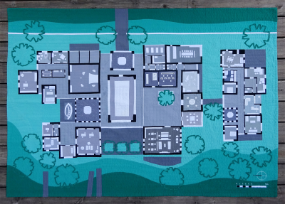 Architect and quilter, I asked the Internet if anybody would like to contribute to a dream country house by sewing a room for it. Everyone was free to choose the function, size and equipment/furniture of their room. I only specified the scale (1:50) and the colors (black for walls, white for doors, windows and furniture, grey for the floor) so that everything would look coherent. 22 women +1 teenage girl from 3 countries participated - absolute beginners, long time seamstresses and experienced quilters. I arranged the rooms and added some as well as corridoors, halls and outside spaces. Our country house has everything we need for a wonderful getaway - sewing rooms, a swimming pool, spa, photo studio, cinema, big kitchen, libraries and more, surrounded by a lush green garden. The quilt was machine quilted in sections and then put together. The common areas and the landscape are hand quilted.