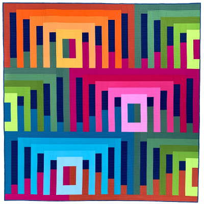 This quilt design uses a courthouse steps variation of log cabin blocks. The blocks are missing their bottom half on purpose as a reminder of the Supreme Court's recent extremely partisan decisions. Color is used to mingle the blocks into a secondary pattern. Tradition piecing with 2.5 inch strips was used throughout.