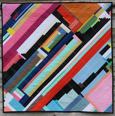 The Boulevard is the main thoroughfare through my small city in Virginia. It’s a four-lane route with restaurants and businesses flanking each side along with strip malls. I live a block off The Boulevard. At night I see the lights of the businesses and the streetlights from my living room. In the early morning, it is quiet, and I hear the trains flying by parallel to The Boulevard. In this piece, I explored different ways of making a log cabin block to give the feel of The Boulevard. My starting point was elongated log cabins, then playing with the width of the strips. I added a traditional log cabin block to represent my home just off The Boulevard.