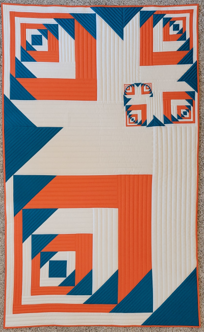 "If you follow the path in a gentle spiral, you'll come to Fibonacci's Cabin out on the prairie. The setting is quiet and serene with just a few pops of color from the wild flowers and the blue sky overhead." I chose a modified log cabin block to play with the ideas of negative space and scale. While the eye is drawn by the growing spiral, the math behind the blocks follows the Fibonacci sequence where each number is the sum of the two numbers that precede it. As the scale of the blocks increases, the open space becomes a vast expanse inviting the viewer to wander through the pieces.