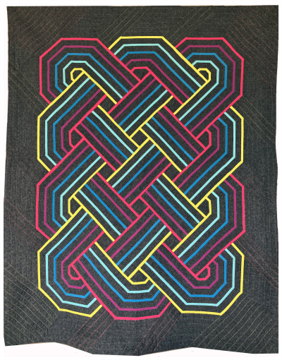 Playing with the idea of the traditional Celtic (or Gordian) knot quilt, I redesigned the layout in a way that felt more modern and used bright neons on a charcoal linen-cotton to create a dramatic contrast of color and texture. Following the bright lines of the design all the way through their progression around the quilt was mesmerizing and I wanted to emphasize that with geometric quilting using fluorescent threads.