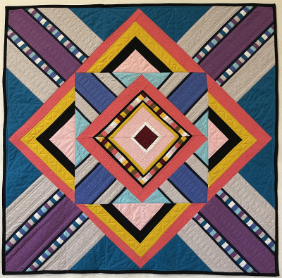 This quilt was made during a workshop with Maria Shell where we were challenged to make a modern design from a traditional quilt block. I chose the “square inside a square” block and decided to experiment with alternating warm and cool colors to see if a depth effect would result. The visual impact of this quilt surprised even me. It’s trippy!